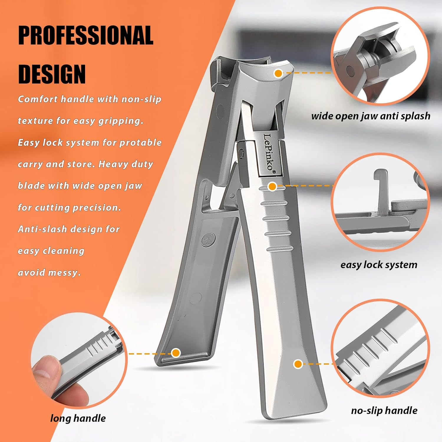 - Professional Design - Long handle with non-slip texture for easy gripping. Auto rebound spring for labor-saving. Anti-splash with catcher for easy to clean avoid messy. Come with a nano glass nail polisher to quickly and safely smooth uneven nail and toenail surfaces.