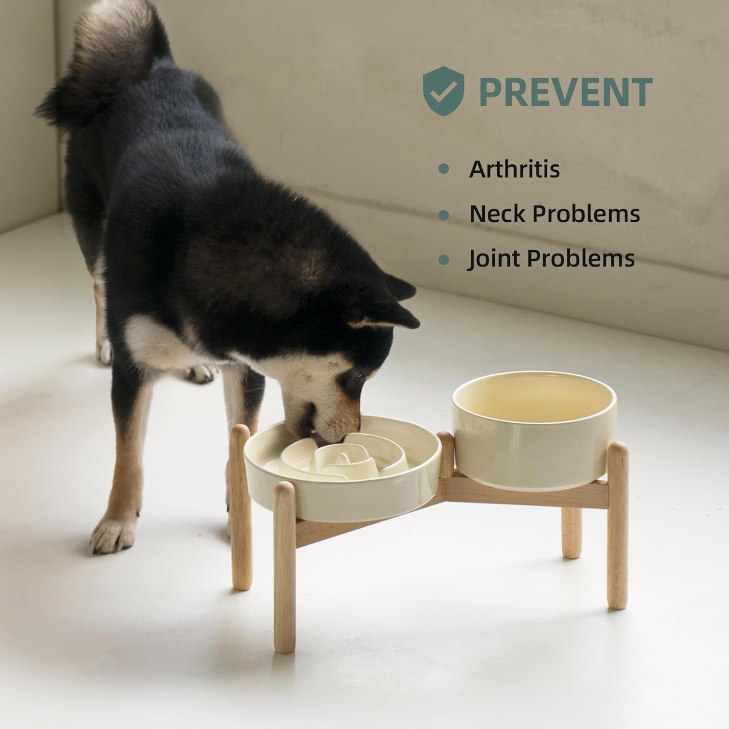 Ceramic Raised Slow Feeder Dog Bowl Set, Elevated 6.1inch Bowl and 7.3inch Puzzle Slow Food Dish with Wooden Stand for Small and Medium Dog, Anti-Gulping (2X Beige+ Stand)