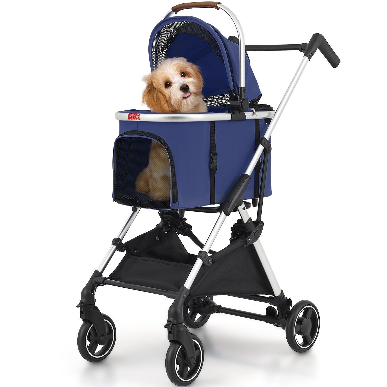 Pet Stroller with 4 Wheels for Small/Medium Pets, 3 in 1 Travel Foldable Detachable Carrier for Dog Cat Cage Jogger Stroller, Rear Wheel Breaks, Storage Basket, Car Seat (Navy Blue)