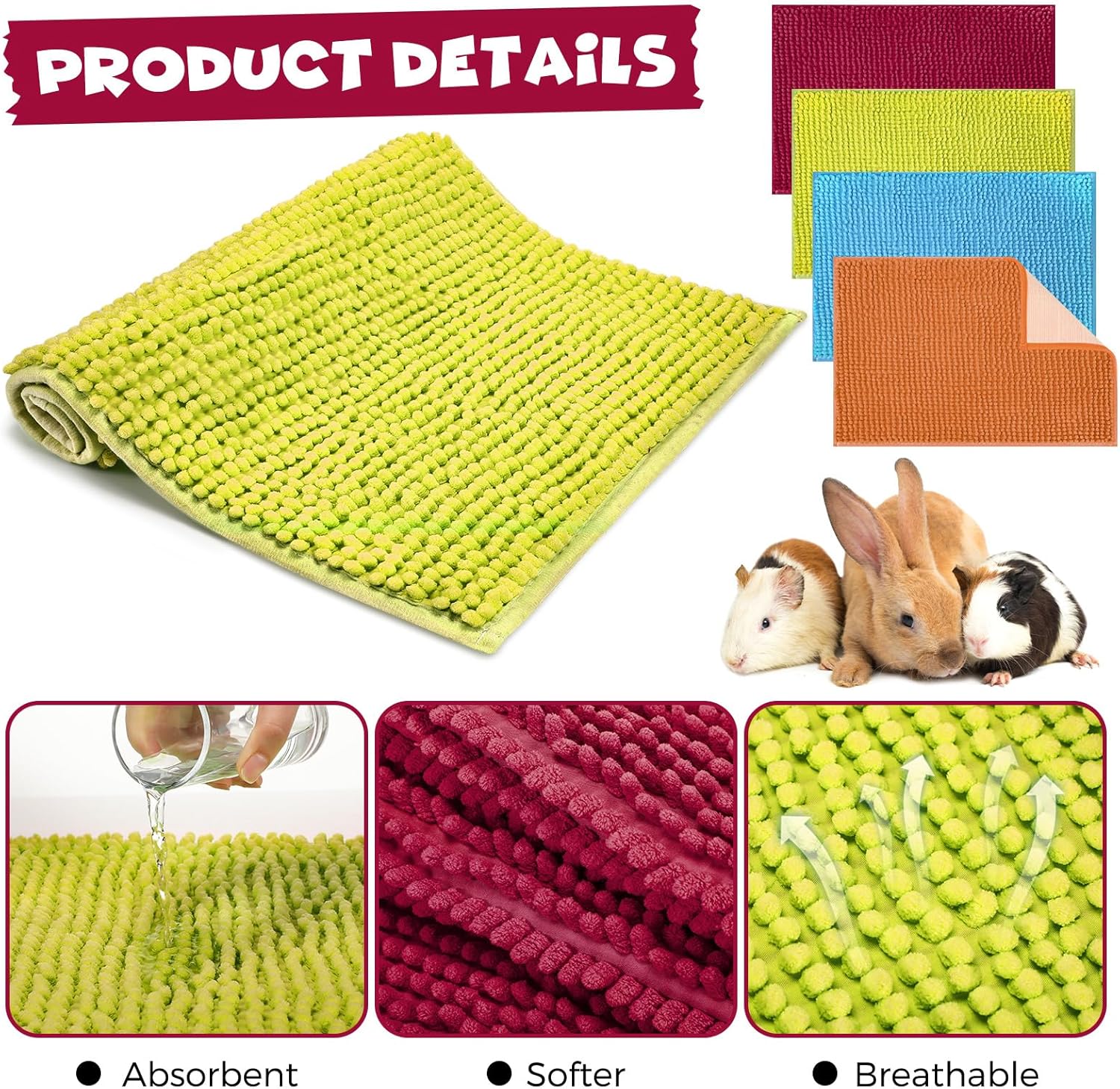 - Comfort and Stability: crafted from microfiber chenille, which is known for its comfort and absorbency, these rabbit bedding mats are soft and comfortable for your pet; The sturdy material and smooth surface ensure a cozy living environment; Moreover, the inclusion of a non slip design on the back ensures the liner stays in place, providing comfort and stability for your pet