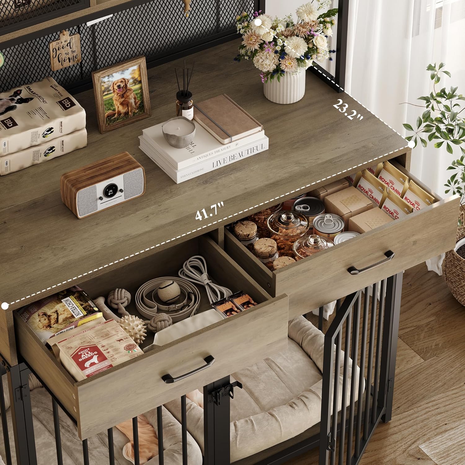 - LARGE STORAGE: The dog crate comprises the top storage hutch, 2 large drawers and a generously spaced living area at the bottom, which can not only provide ample room for dog's toys, food and leashes, but also allow you to showcase an array of delightful canine-themed decor items