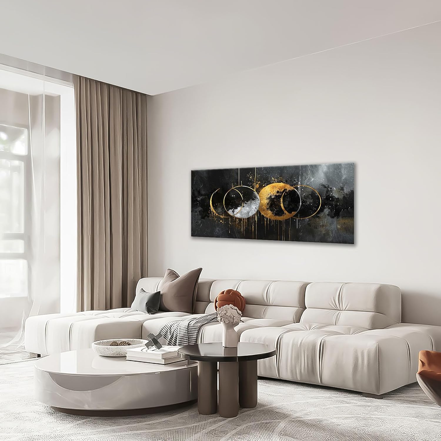 - 【Unique Design】A digital painting of four circles painted in black and gold on an abstract background, the smooth lines can be seen as the movement between the moon and the sun. The composition is balanced and vibrant.