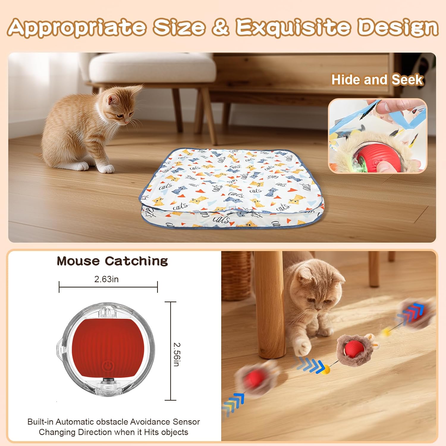 Rocfish Interactive Cat Toys Ball - Automatic Fast Rolling Ball in Play Mat, Hide and Seek Mouse Catching Game, Low-Noise Cat Enrichment Toys in Pouch for Indoor Bored Cats (Red Toy & Square Mat)