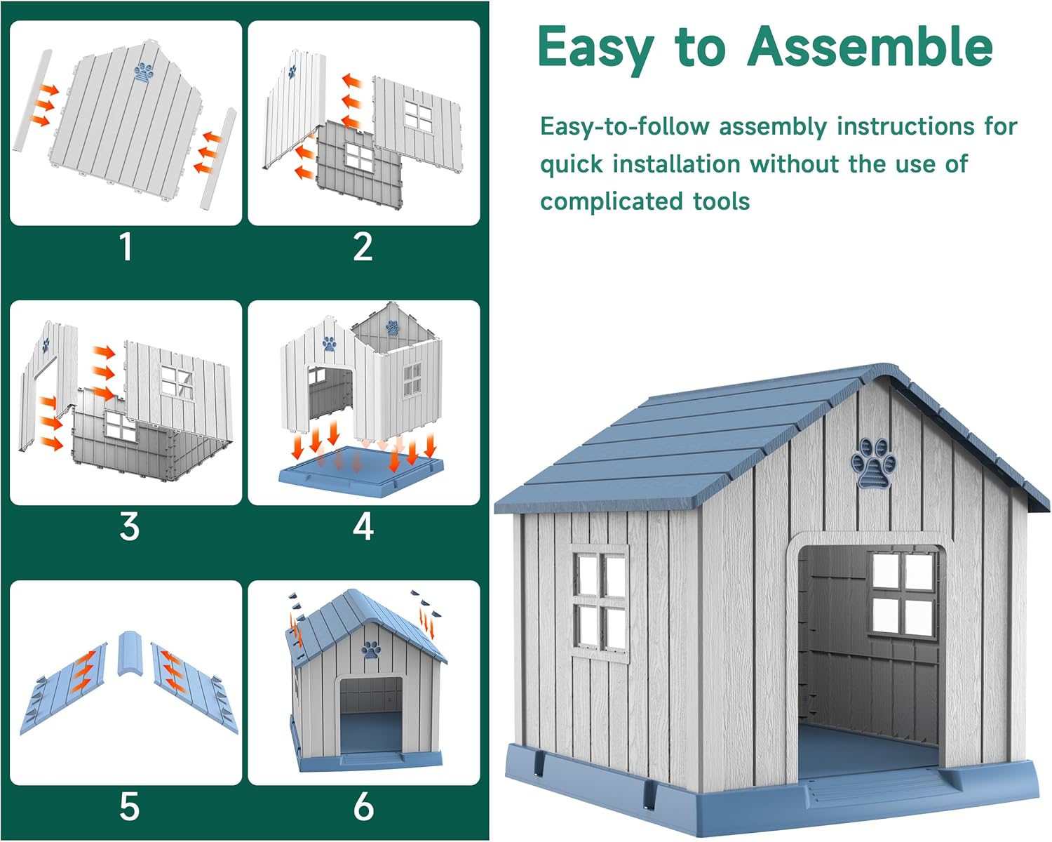 - Superior PP Material: Crafted from high-quality PP material, this doghouse is waterproof. This ensures a clean, dry, and safe living environment for your furry friends all year round.