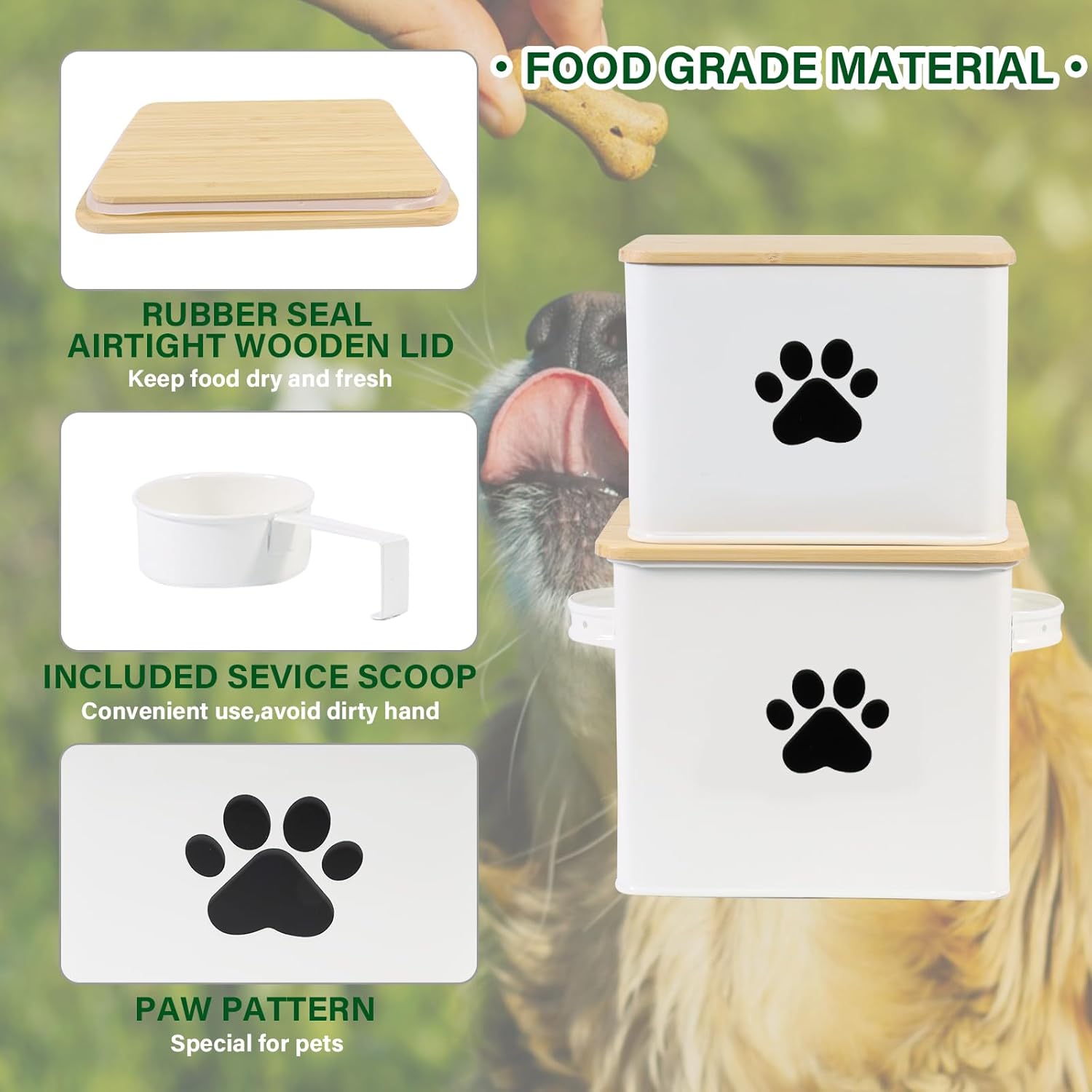 Set of 2 Airtight Dog Treat Container -10lb Metal Dog Food Canister -Dog Treat Jars for Kitchen Counter with Bamboo Lids-Pet Puppy Food Bin with Food Scoop- Doggie Cookie Jar-White