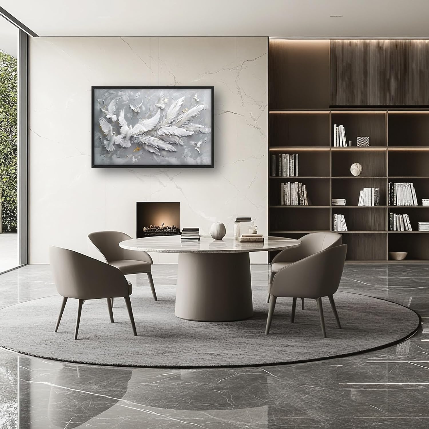 - 【Unique Design】3D abstract painting of white doves with long feathers, flying in the air. The background is gray and textured. There should be no shadows on it. In front, there will also be other light-colored birds, and they can have different shapes. Together, they form an artistic composition that symbolizes peace or freedom. White feathers on wings, full-length, high detail.