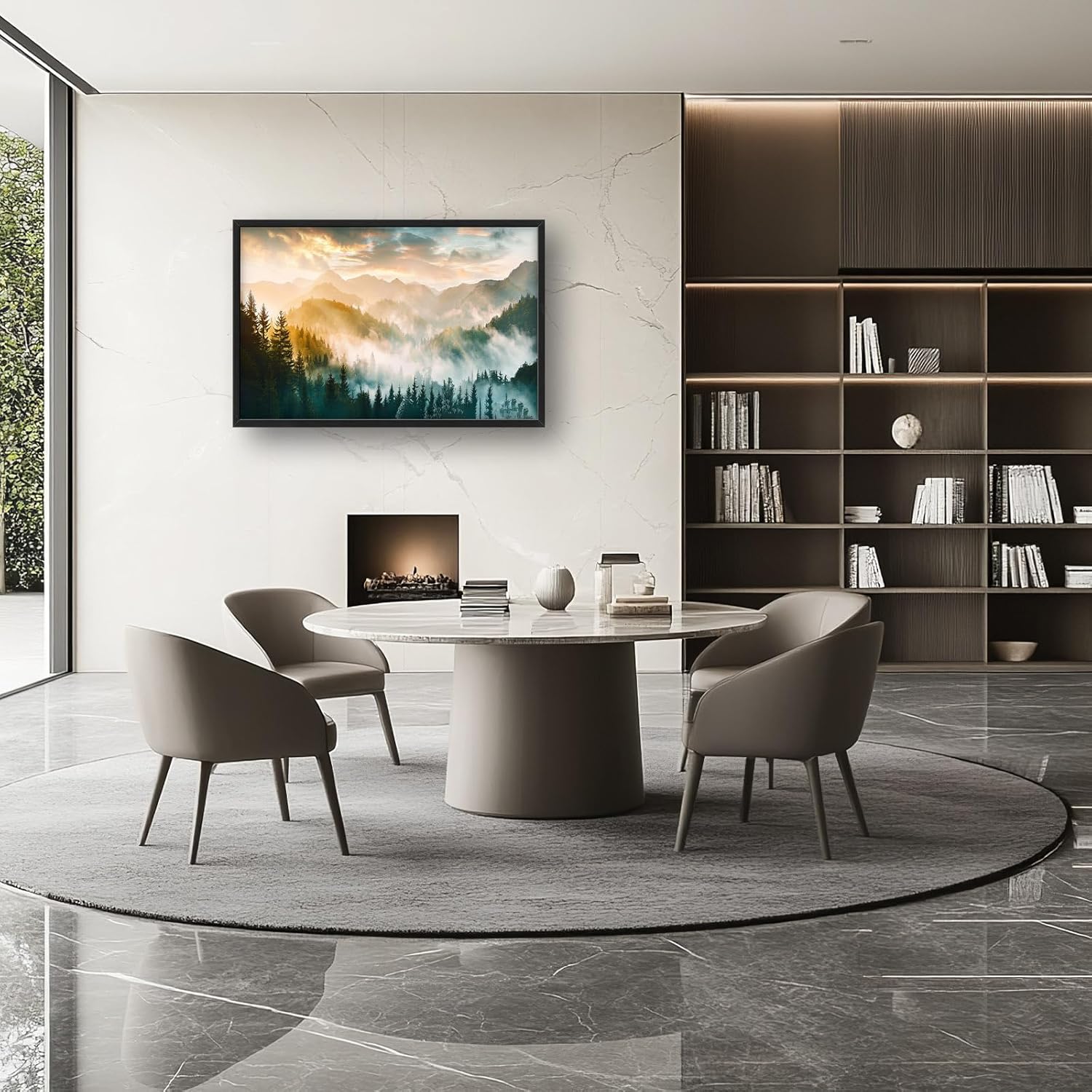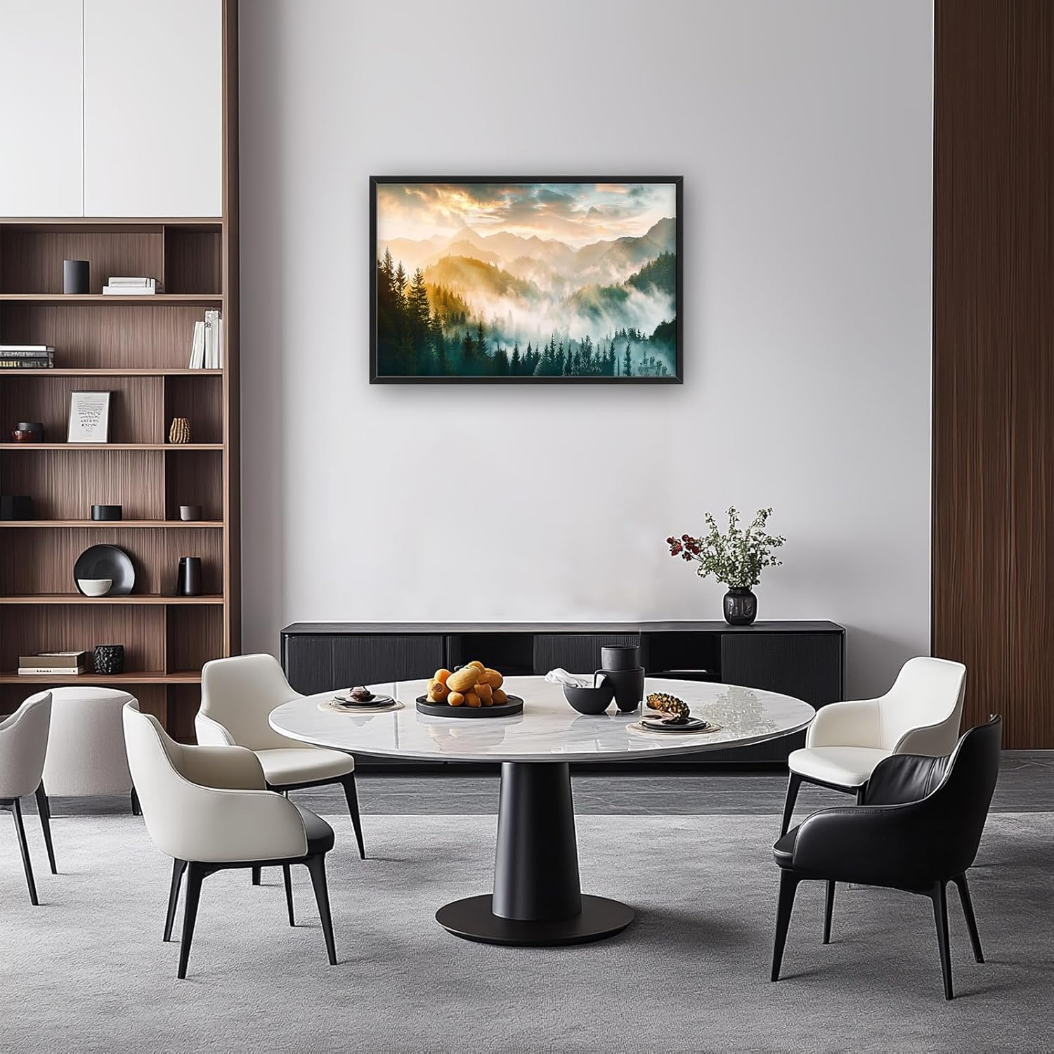 - 【Unique Design】A panoramic view of mist-covered mountains and dense forests, bathed in the soft glow of sunrise. The scene captures an enchanting atmosphere with ethereal clouds and gentle sunlight filtering through the trees.