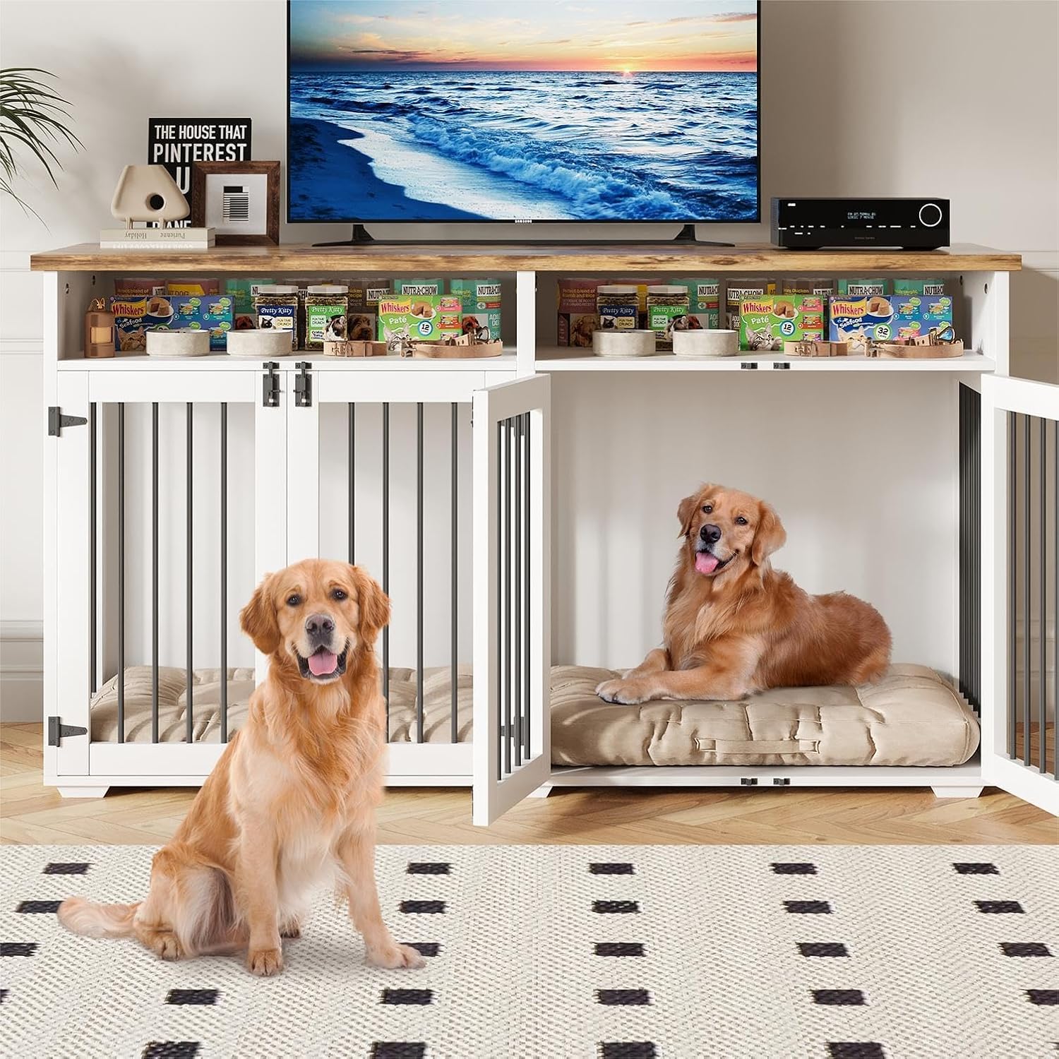 - PLENTY OF STORAGE SPACE: This indoor dog kennel indoor has 2 spacious storage compartments on the upper part of the crate, which is convenient for you to store dog food, dog toys, leashes and other essentials, fully meeting your storage needs for pet supplies, and the top counter can be used for your decorations, photo frames and so on
