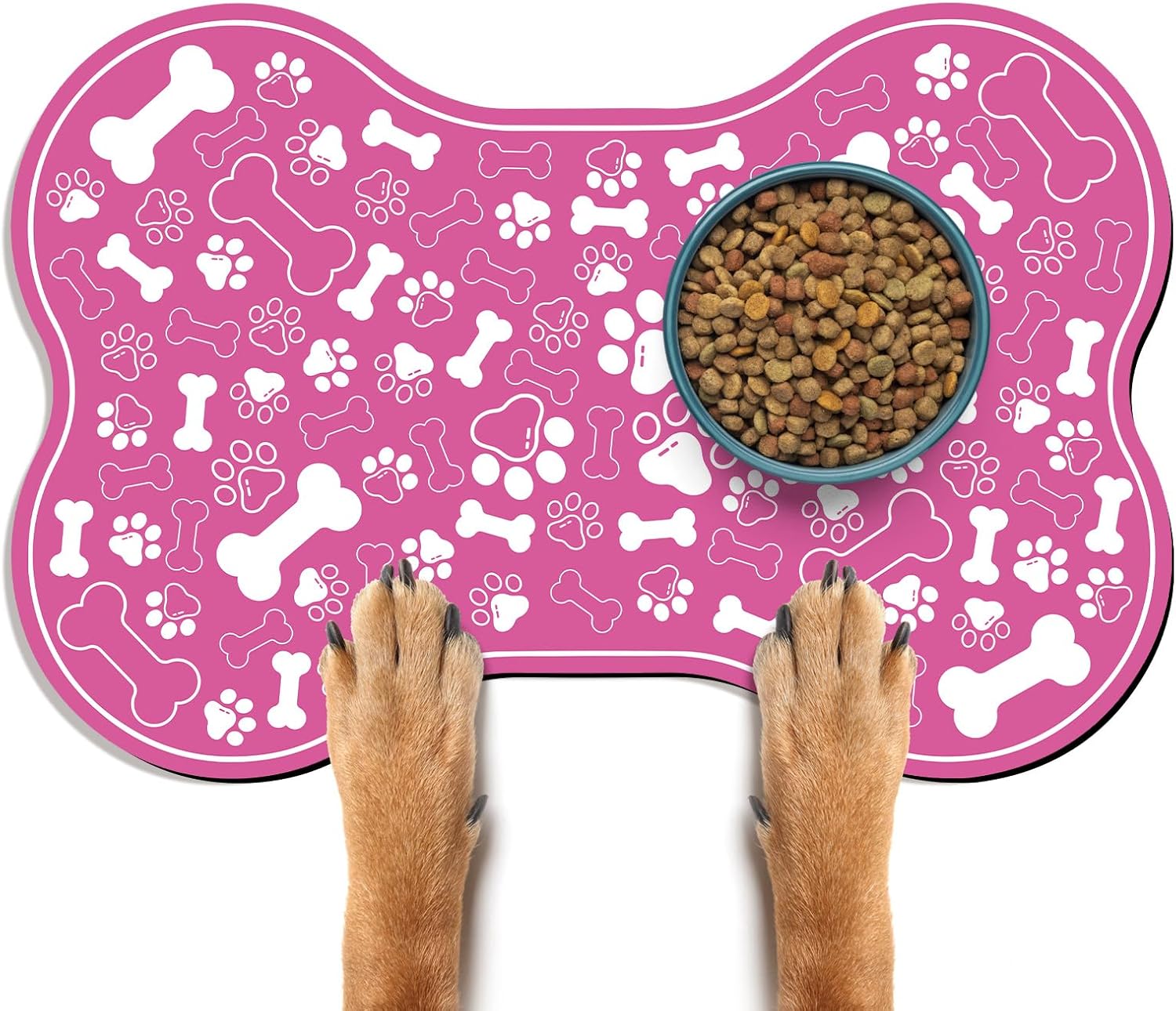 - CUTE AND FASHIONABLE DESIGN: Our pet feeding mats are designed with dog paw and bone motifs, very interesting. It is available in a variety of colors, sizes and shapes to provide a unique dedicated space for your pet's food and water bowls, and you can choose a style that matches your home dΓ©cor.
