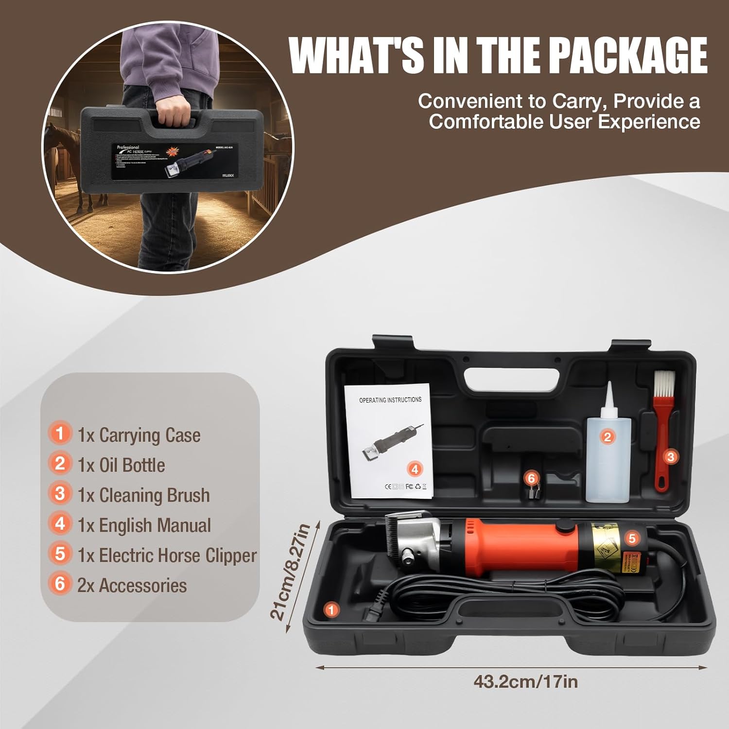 - 【LOW NOISE】: The noise level of this electric horse clipper is only 75dB when working, which will not frighten the animals, and give you a more quiet and comfortable shearing process.