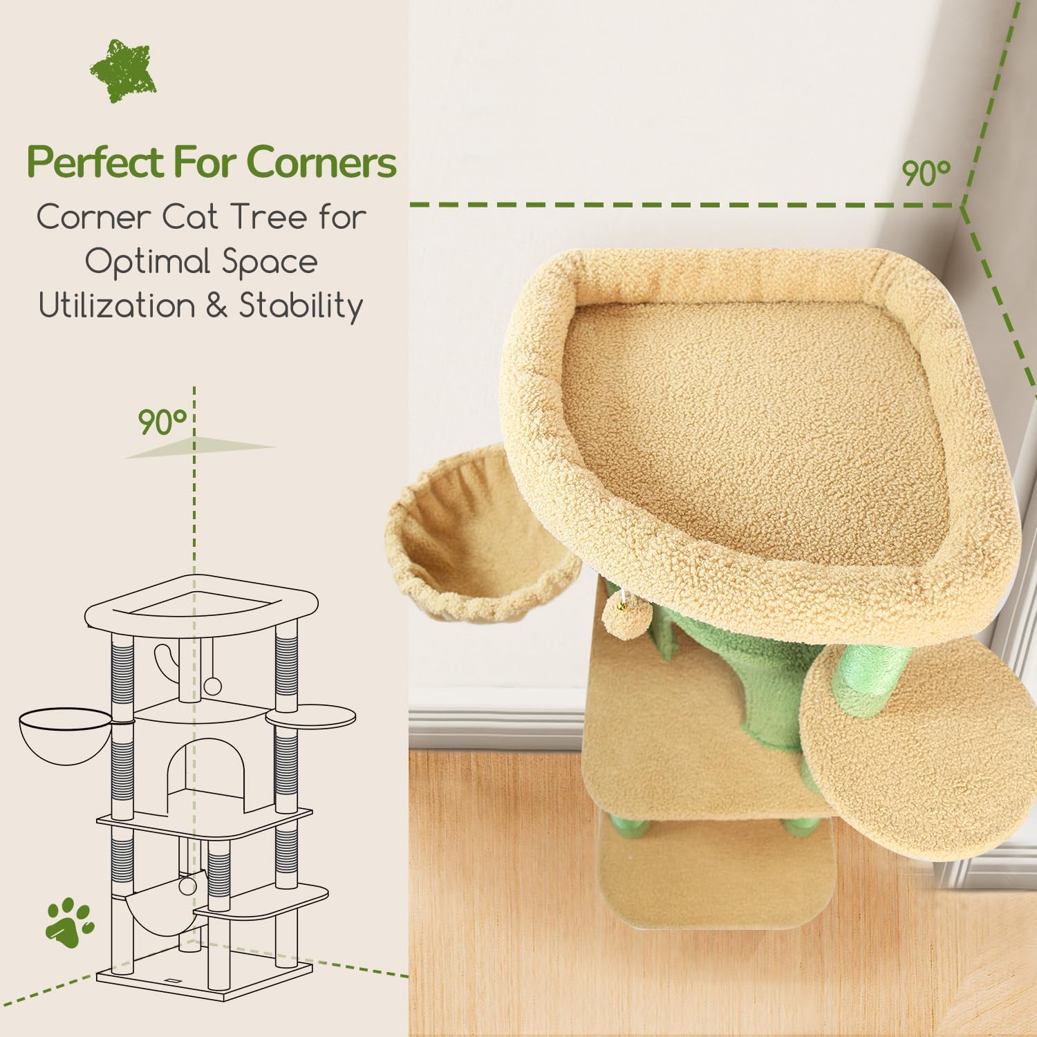 - Perfect Use Corner Space: With a fan-shaped structure design, this cat tree condo tower is tailored for the corner space of the home, effectively saving space. Placed close to the corner of the wall, it enhances overall stability, reduces the risk of shaking and tipping, and ensures the safety of cats when climbing or jumping