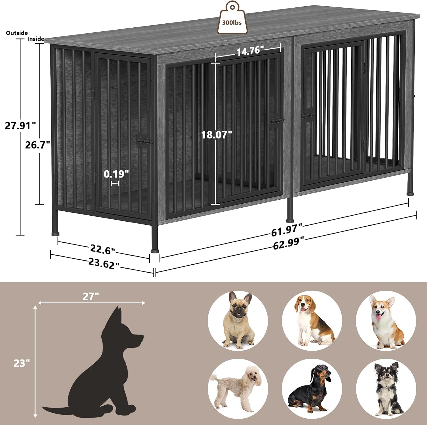 - 【Provide Ample Space for Dogs】: With 63" W x 23.62" D x 27.56" H dimension, the dog kennel furniture can allows 2 dogs to have a comfortable and spacious living space, avoiding anxiety and unease due to limited space. The middle partition can be installed or removed according to your needs, the specific installation steps can refer to the detailed manual.