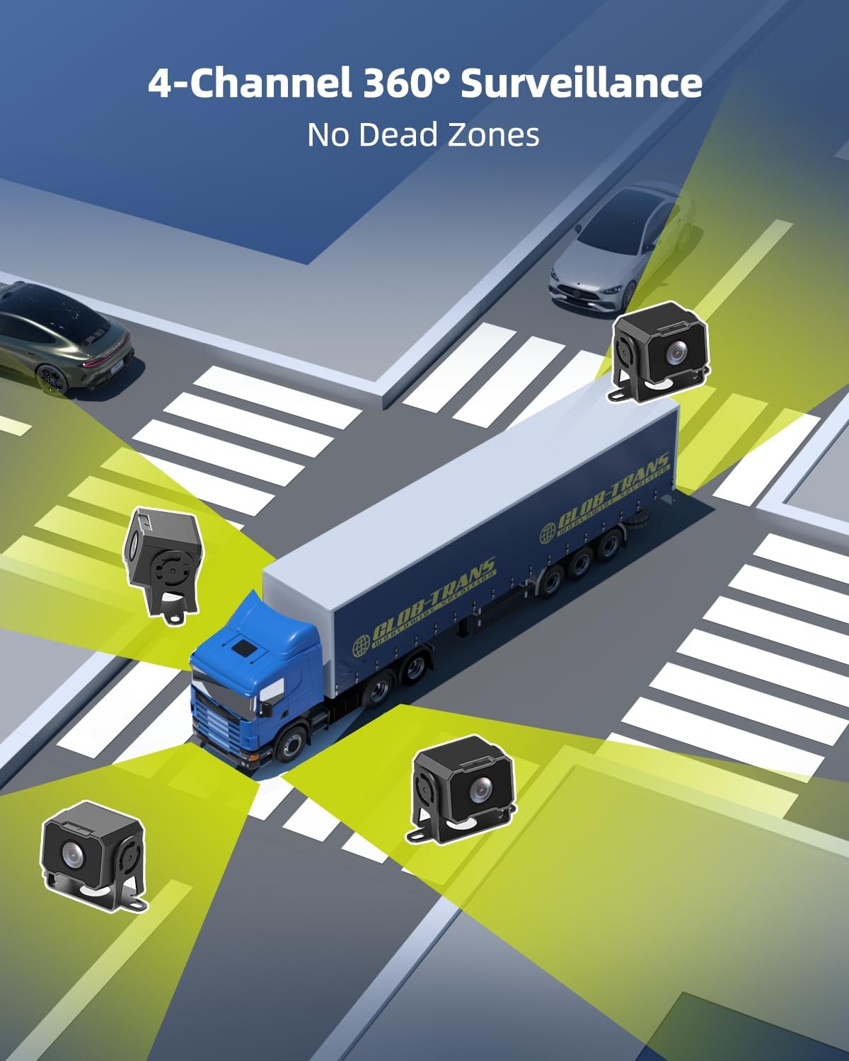 - 【10.2" HD Touchscreen Display】Equipped with a 10.2-inch full-view HD touch screen, it supports synchronous decoding and display of four video streams, and innovatively adopts split-screen/full-screen dual-mode switching technology. Through multi-touch interaction, you can zoom in on any channel to full-screen mode with one click. The system integrates a DVR recording module, supports local storage and intelligent loop recording, and realizes seamless video management.