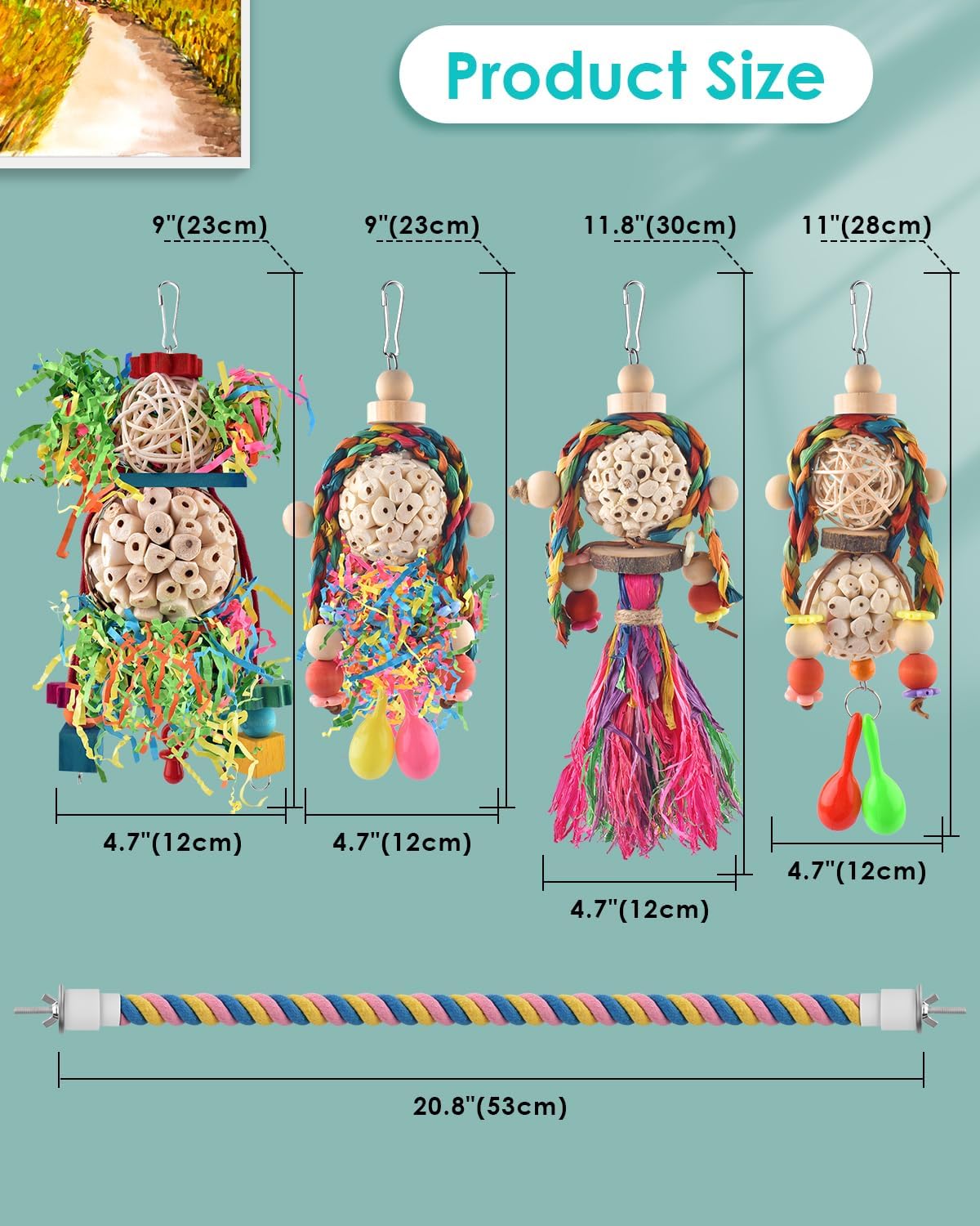 - Suitable Birds' Size: 5 peice parrot toys suitable for small and medium-sized birds, such as Cockatiels, Finches, Lovebirds, Conures, Parakeets, etc