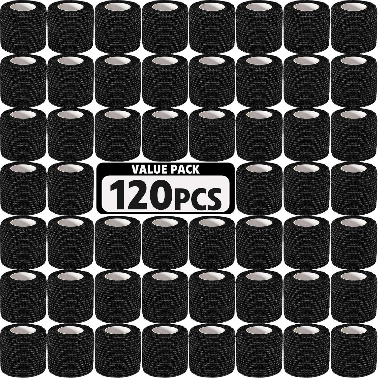 - Self Adhesive Bandage: Package includes 120 rolls of black self adhesive bandage wrap. Each roll measures 2 inch wide and 5 yards long after stretching. It easily adheres to itself but will not stick to other surfaces such as skin or hair, making it easy to pull off and change bandages