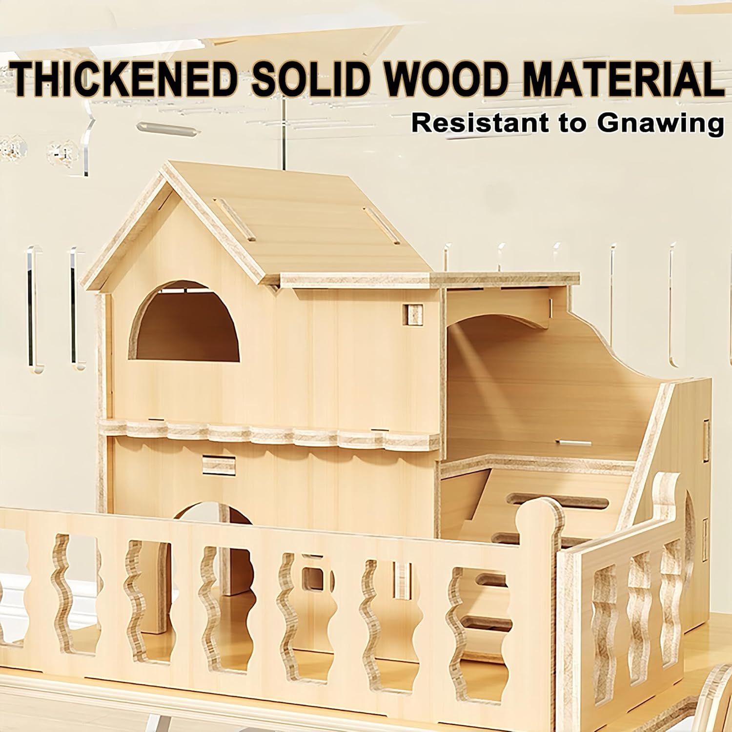 - 【Including All Accessories】 The hamster house is fully functional, including a European-style wooden house, a food bowl, stairs, an 18cm oversized silent running wheel, an arch bridge toy, an external bathing area and a water bottle with a steel ball inside to prevent leaks. Provides plenty of room for hamsters to dig and play. This is definitely a comfortable hamster habitat .