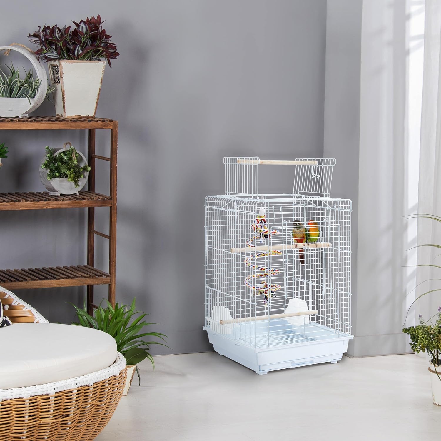 - Lightweight yet sturdy: This birdcage is crafted out of powder-coated metal and HIPS plastic with good impact resistance. The metal frame adding excellent water resistance makes this parrot cage a durable and safe sweet home for birds