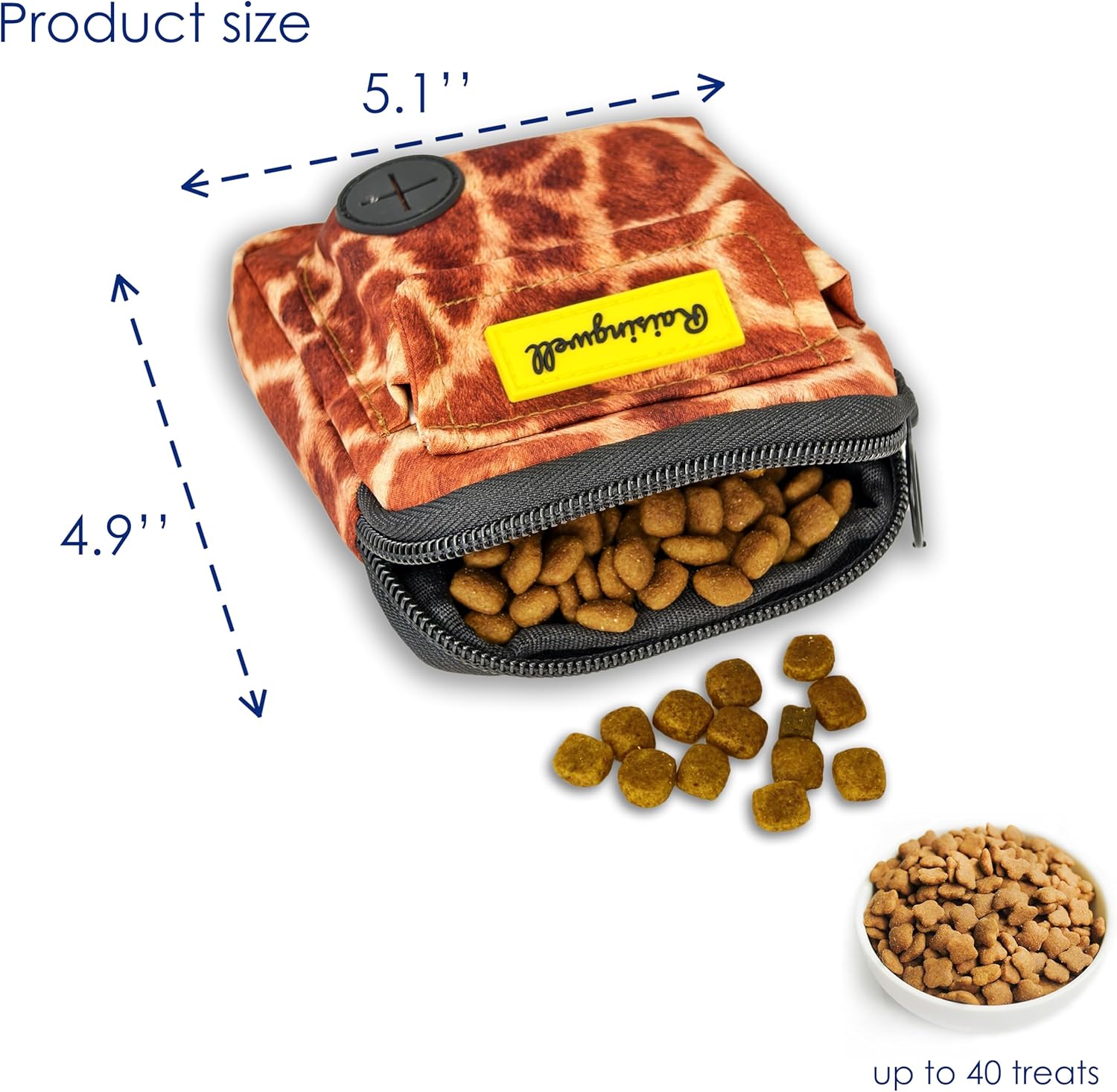 - Raisingwell Dog T1、Fashion Design: This dog training treat bag measures 4.9 x 5.1 inches and offers versatile wearing options. It comes equipped with a carabiner and a strap, allowing you to hang it on your leash, attach it to your pet's collar, or even wear it as a trendy accessory on your bag. The bag features a zipper closure, ensuring that treats stay secure inside even when you're playing with your pet afterward. It's perfect for carrying around or using during short outings.reat Pouch