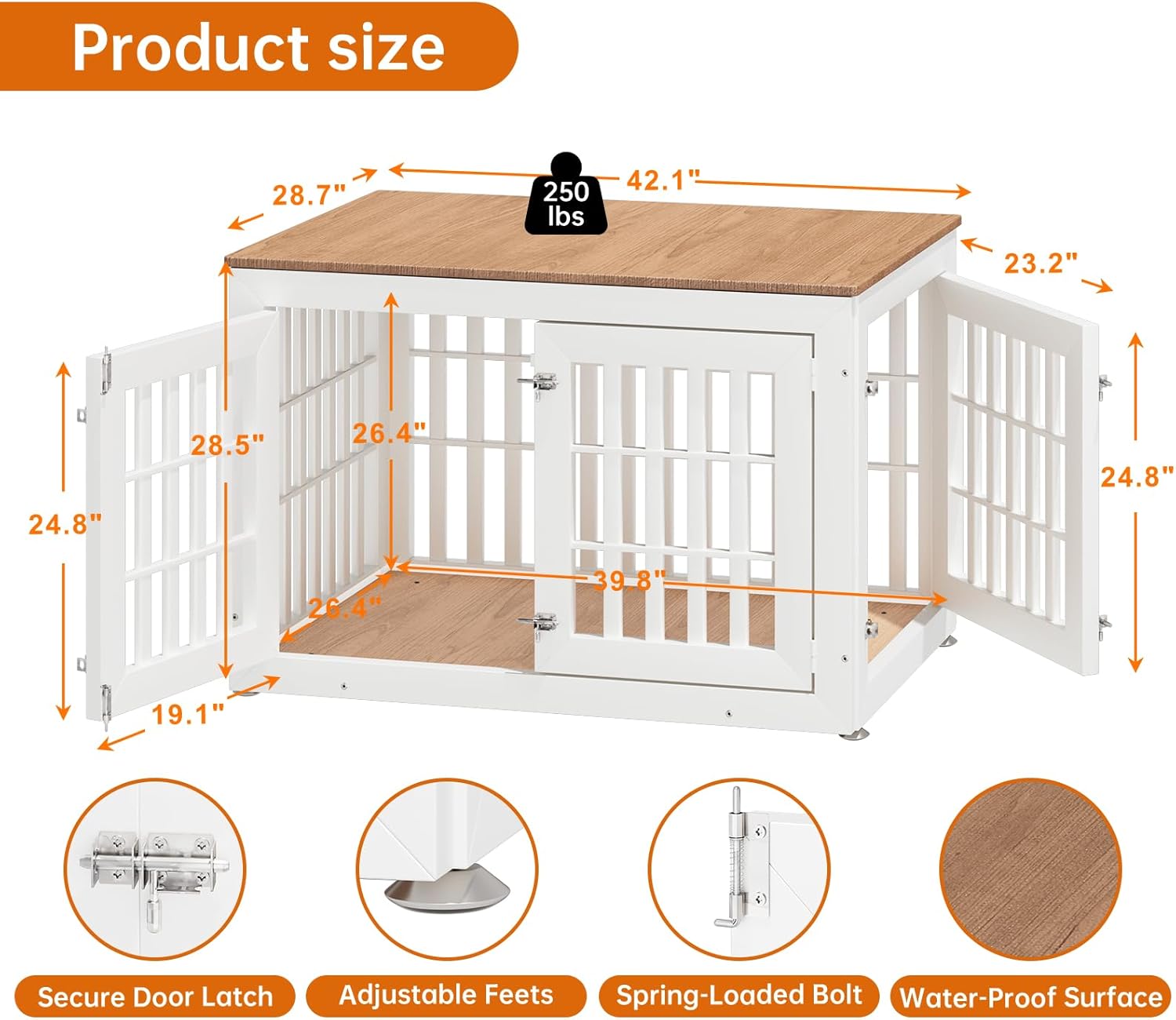 42" Heavy Duty Dog Crate Furniture for Small,Medium and Large Dogs,Rustic Wooden Dog Cage Kennel Indoor Furniture with Waterproof Top,Decorative Pet House Side End Table (White & Wood)