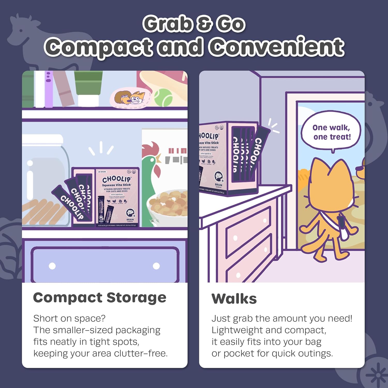 - COMPACT DISPENSER PACK: This Brain Support pack includes 49 sticks to treat your cat or dog. Itโs perfect for quick, grab-and-go use, easy to carry in a bag for trips, or convenient to keep near your pet supplies.