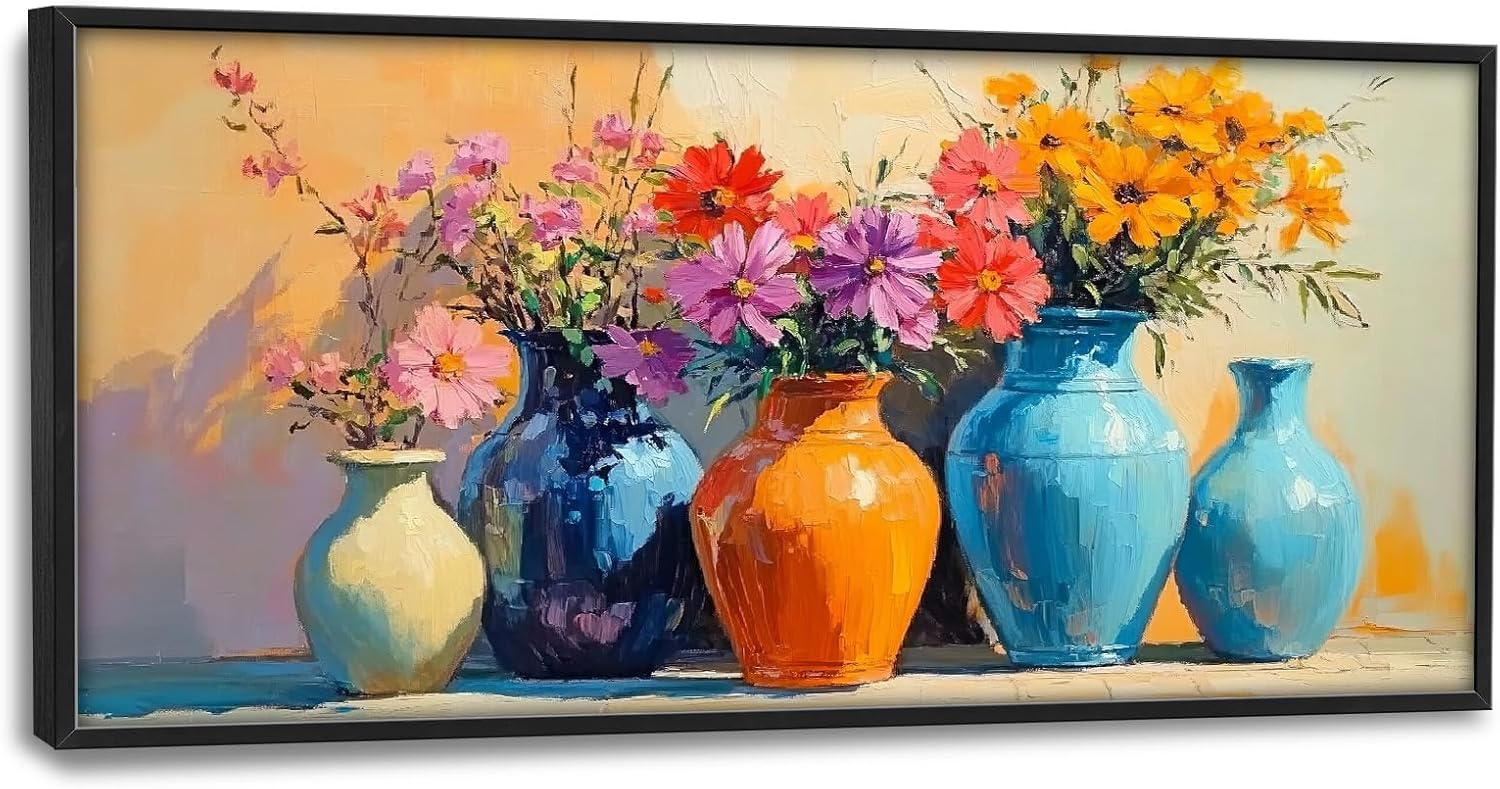 Large Colorful Floral Wall Art for Living Room, Framed Oversized Asian Flower Vase Decor Canvas Painting Sunlight Pictures Modern Artwork for Bathroom Bedroom Office Dining Room 60"x30"