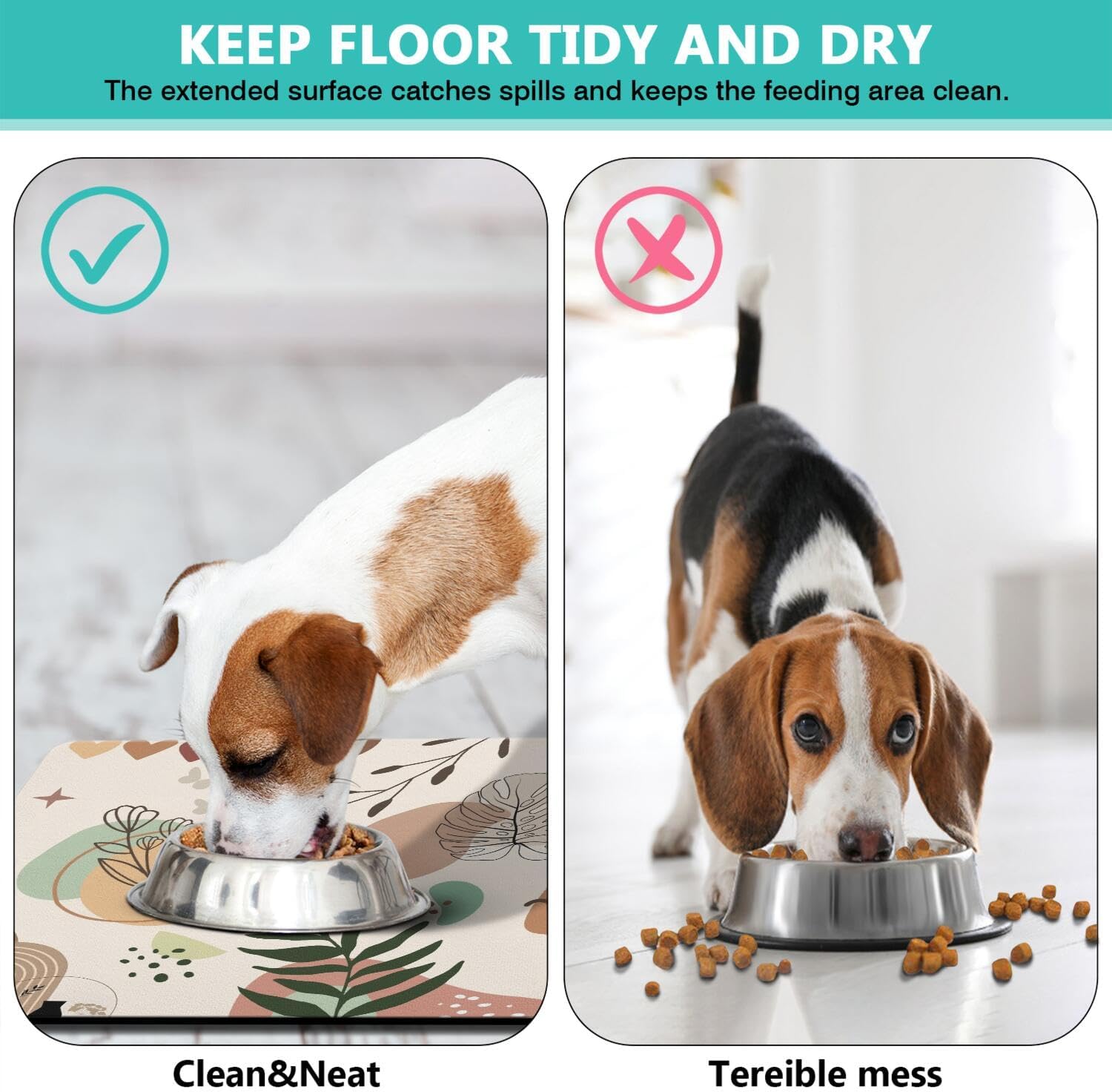 - Dog Food Mat & Cat Food Mat - Our premium pet food mat provides the perfect solution for messy drinkers/eaters! This extra-large pet feeding mat catches all spills from dog bowl mat and water dishes, keeping your floors spotless.