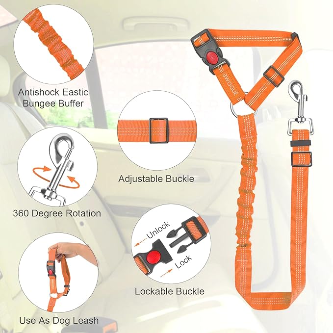 - HIGH QUALITY: Made of high quality nylon fabric to ensure safety, features the solid zinc alloy swivel snap,elastic bungee and quality buckles, The reflective stitching design makes it great for night time use. The elastic bungee helps dog prevent jerking with sudden movement. the pet car seat belt ensures the most safest traveling for your pet, and provides a most relaxing driving experience for you.