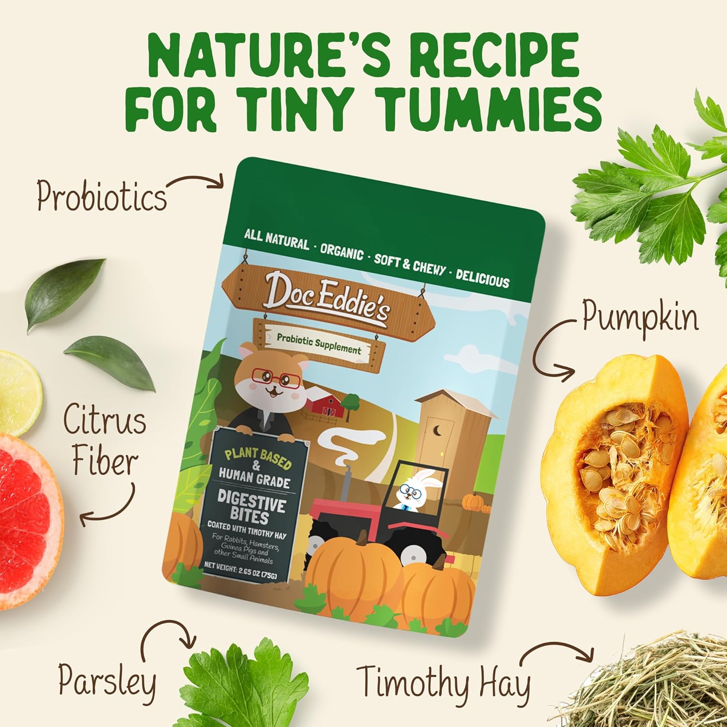 DOC EDDIE'S Digestive Bites - Plant-Based Small Animal Treats for Rabbits, Guinea Pigs, Hamsters, Gerbils, and More - Probiotics Supplement Made with Timothy Hay, Real Fruits, and Veggies