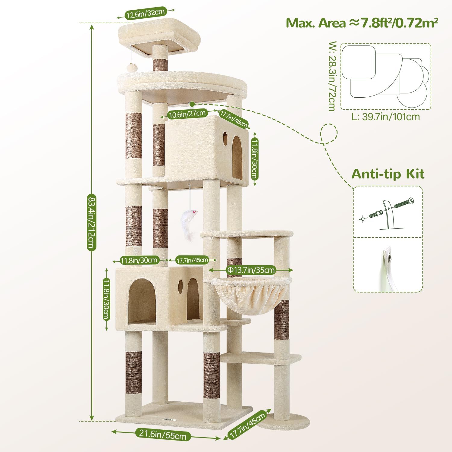 - EXTRA-LARGE PLATFORM: F83 cat tree designed with a 55x45cm fan-shaped platform, offering ample space for activities, allowing adult cats to comfortably observe their surroundings or stretch their bodies.