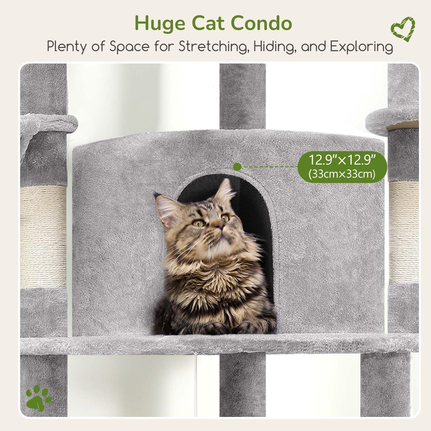 - Natural Sisal Posts: This sturdy cat tree condo tower is fitted with 7 robust scratching posts wrapped in natural sisal, ideal for meeting your indoor catโs scratching needs and protecting your furniture from wear. These durable posts support healthy paw maintenance and encourage natural climbing and exploration behaviors