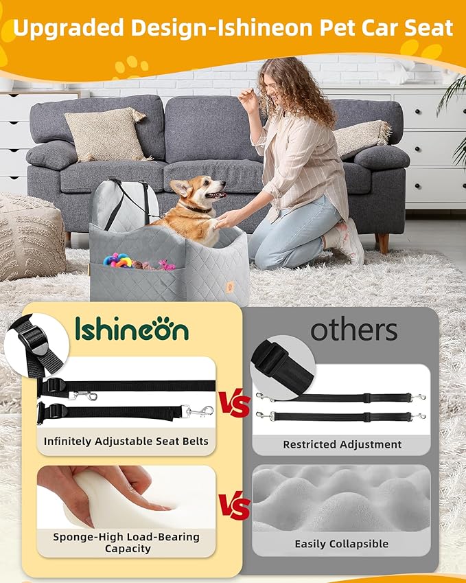 - Premium Dog Car Seat with Enhanced Safety:Upgrade your pet's car travel experience with our adjustable belts that extends up to 23.62" (60 cm). This design keeps your pet firmly in place, preventing accidents and ensuring safety. The elevated 6-inch cushion offers a wider view of the window outside, reducing travel anxiety. Reinforced back strap, headrest straps,and non-slip bottom keep pet car seat stable, ensuring a safe and comfortable journey for your beloved pet.