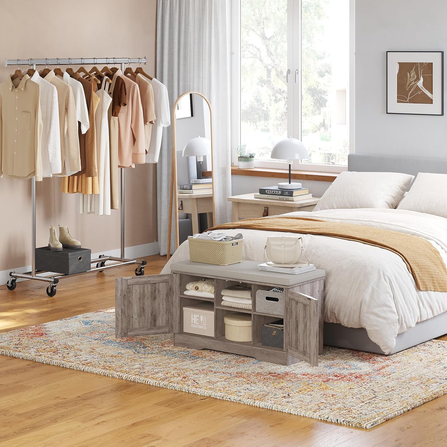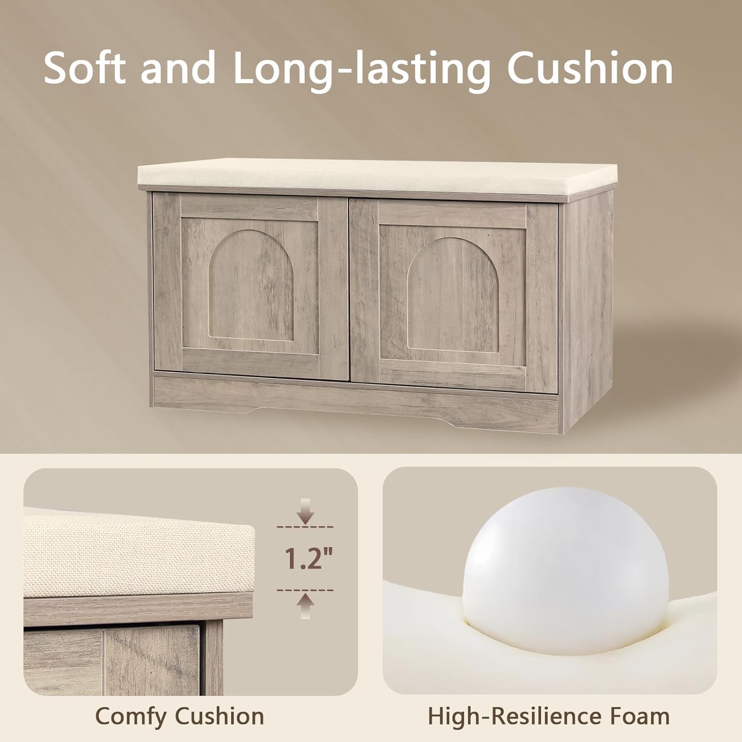 DINZI LVJ Shoe Bench, Entryway Storage Bench with Doors, Cushion, 2-Tier Shoe Rack with 6-Cubby, 31.5”L x 13.8”W Shoe Organizer Cabinet, Adjustable Shelf, Living Room, Bedroom, Greige