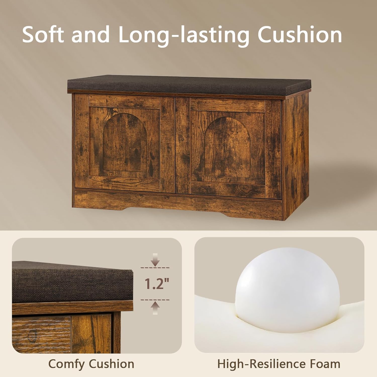 DINZI LVJ Shoe Bench, Entryway Storage Bench with Doors, Cushion, 2-Tier Shoe Rack with 6-Cubby, 31.5”L x 13.8”W Shoe Organizer Cabinet, Adjustable Shelf, Living Room, Bedroom, Rustic Brown