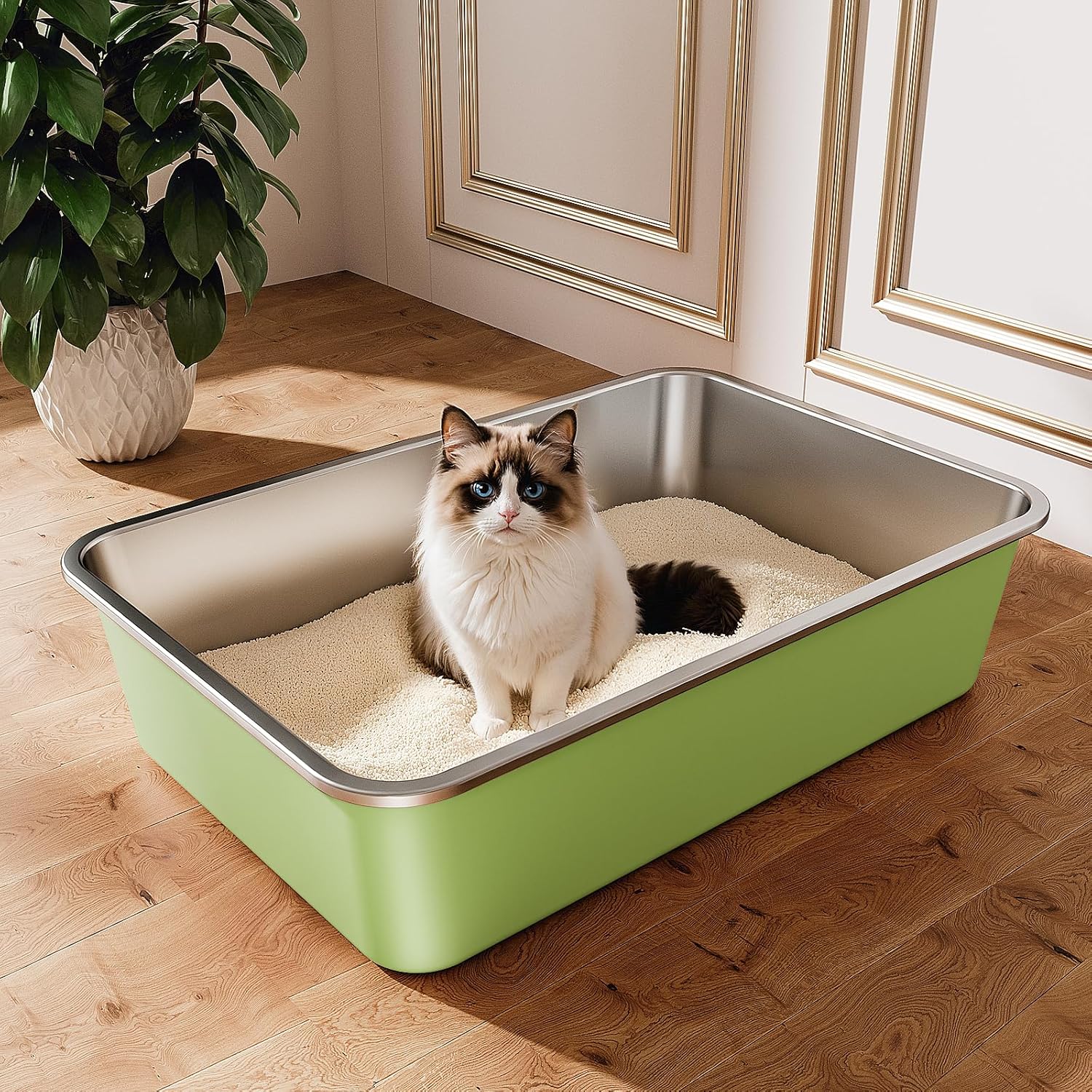 Stainless Steel Litter Box, Large Metal Cat Litter Box with High Sided for Big and Small Cats, Non-Stick, Easy to Clean, Odor-Free, 23.4" L×15.6" W×5.9" H, Leaf Green