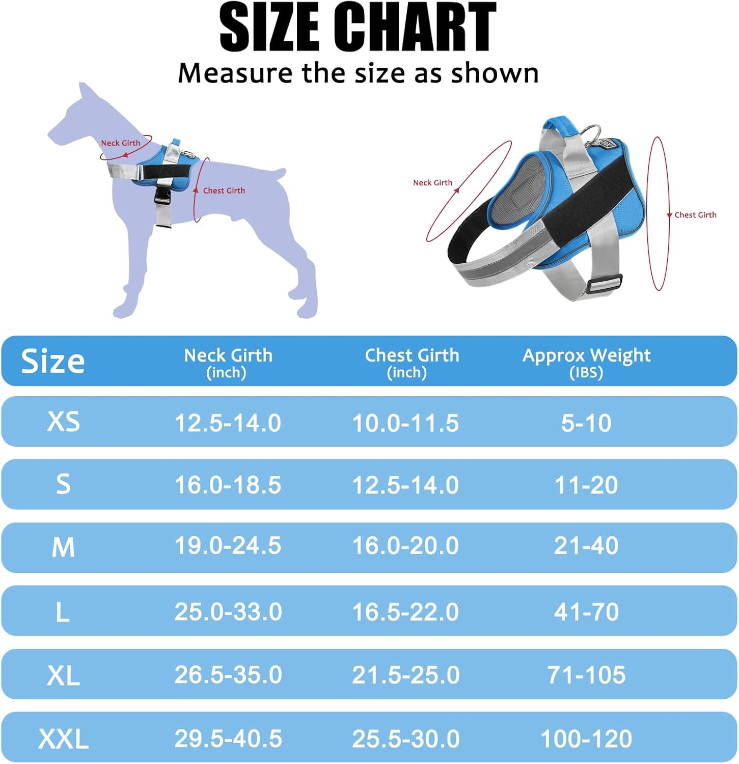 - EXTRA SMALL DOG HARNESS: ★Approx Weight: 5-10 lbs. Neck Girth: 10"-11.5", Chest Girth: 12.5"-16"★. It perfect for extra small dogs and pups, like Yorkie, Chihuahua, Pug, Maltese dog, etc.