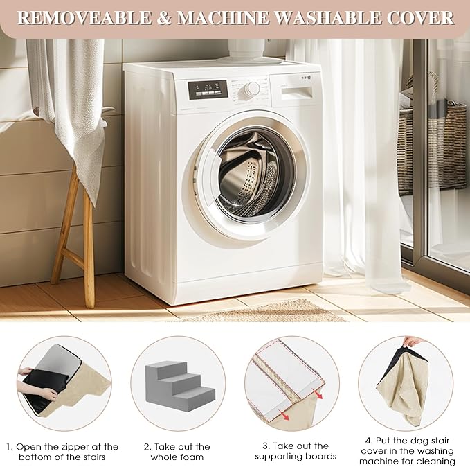 - 【EASY TO CLEAN】 When used for the first time, no assembly is required. After opening the package, allow 48 hours for the stairs foam to rebound. When clean it, just take out the foam and supporting boards. The removable cover is machine washed. Please do not wash the foam to retain shape and support.
