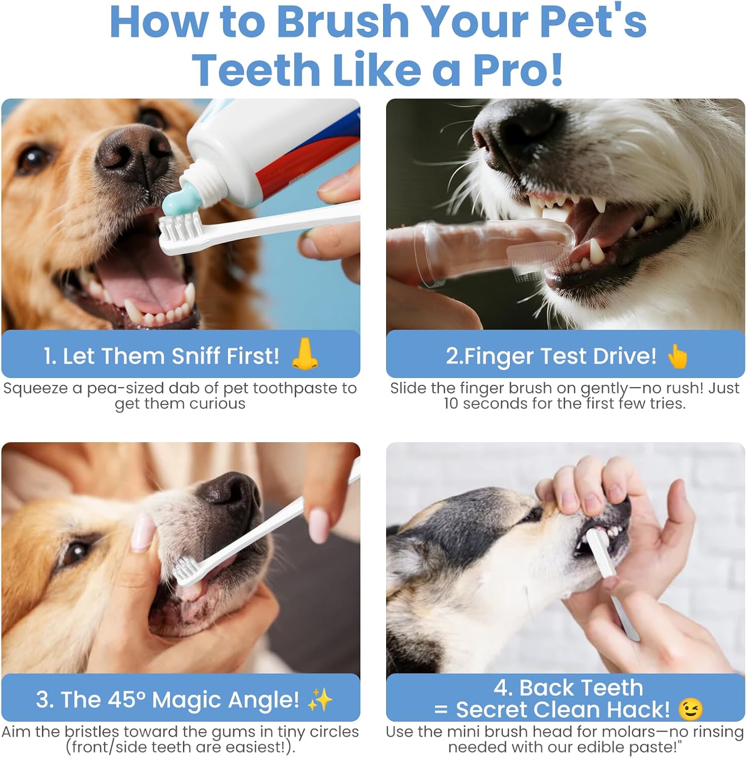 - 【Train Puppies & Clean Plaque in One Step】Finger brush acclimates pets to brushing; 360° and pointed-tip brushes remove tartar between teeth. Ideal for first-time users!