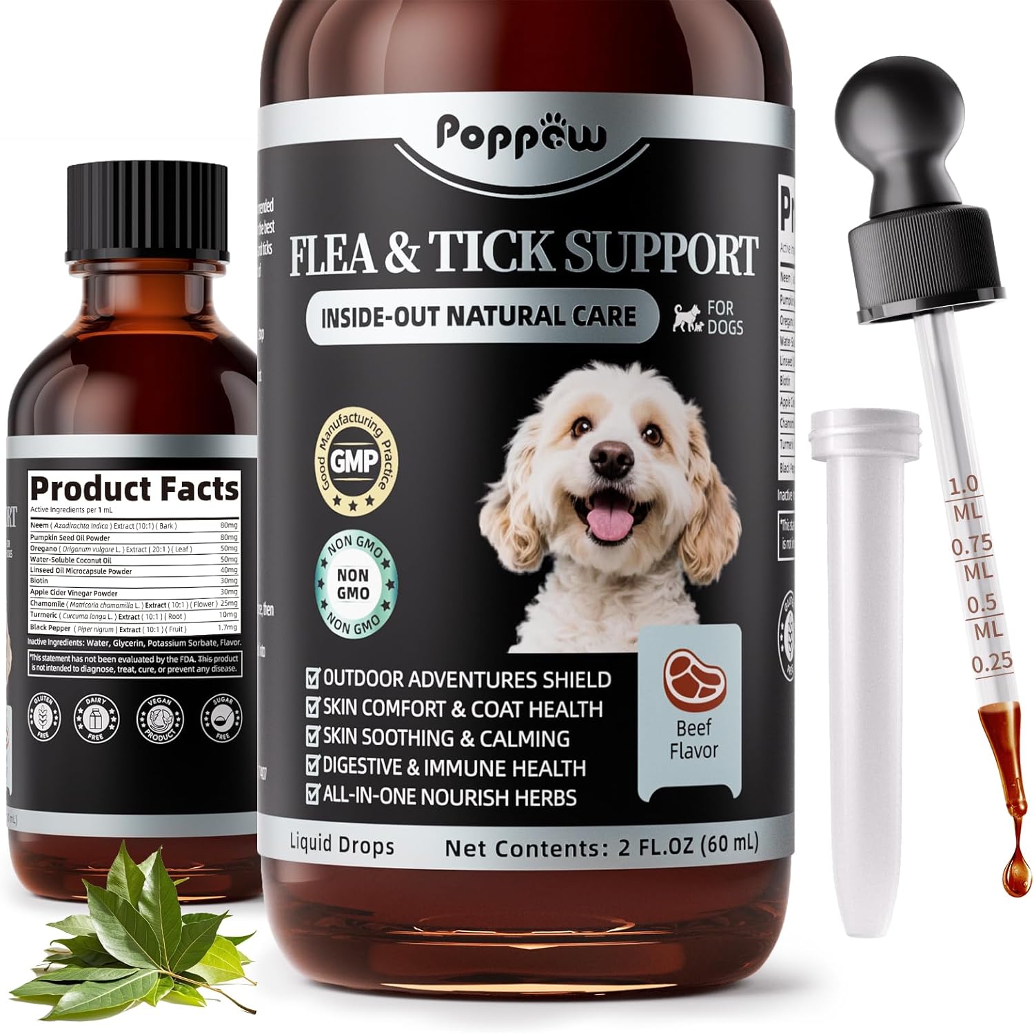 - Tasty & Easy to Feed: No more messy topical flea solutions or harsh chemical sprays! POPPAW natural flea and tick prevention for dogs comes in a delicious chicken or beef flavor. Simply mix the drops with food, water, or give directly into your pet’s mouth. Follow the dosage guide on the package for safe, effective care. Note: Please Remove Sleeve Before Using!