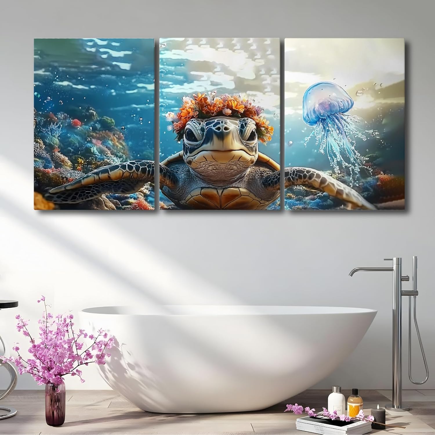 Wivsev Sea Turtle Canvas Wall Art,Under Sea Wall Art,Sea Life Pictures Wall Decor,Ocean Animal Painting for Bathroom,Living Room,Bedroom (16" x 24" x 3 pcs)