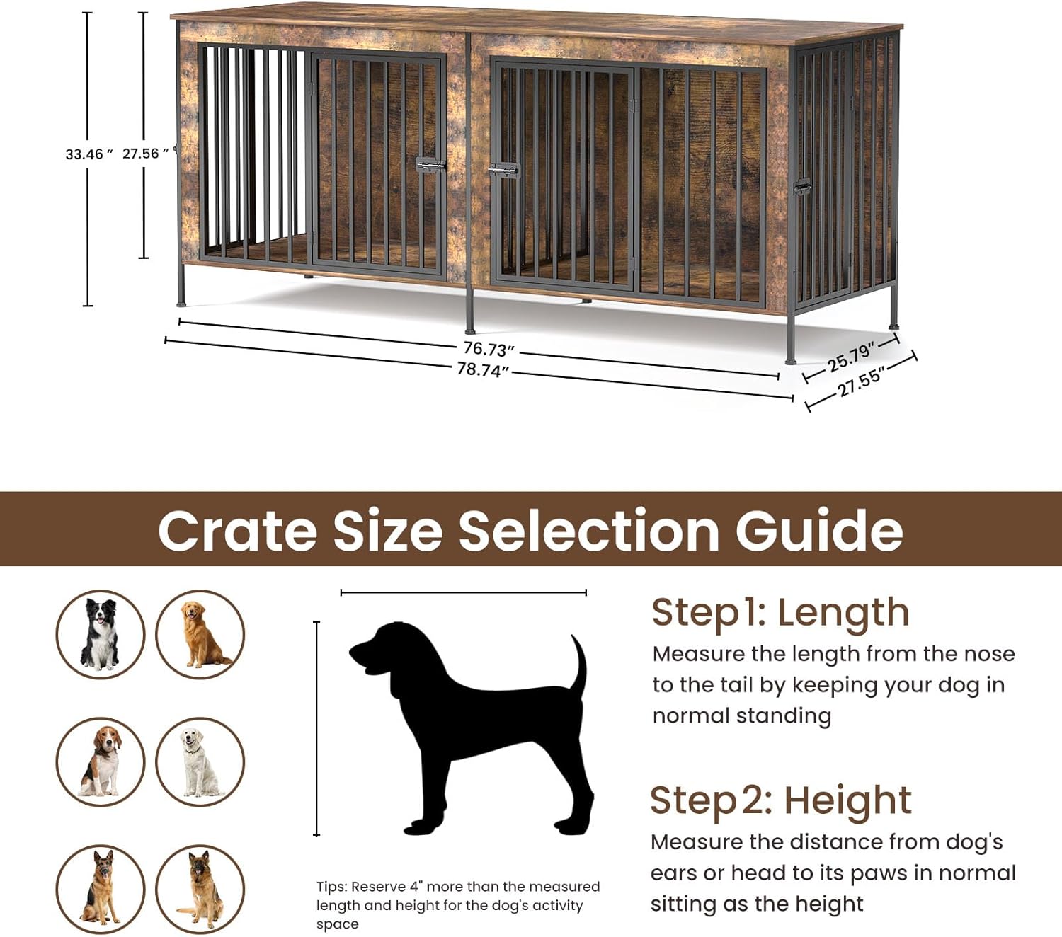- Furniture-Style Dog Crate Table: The long rustic wood top turns the unit into a 78-inch console or TV stand that holds lamps, plants, books and more. It blends with modern, farmhouse or industrial dรฉcor, saving floor space by combining storage and a stylish dog cage furniture piece.
