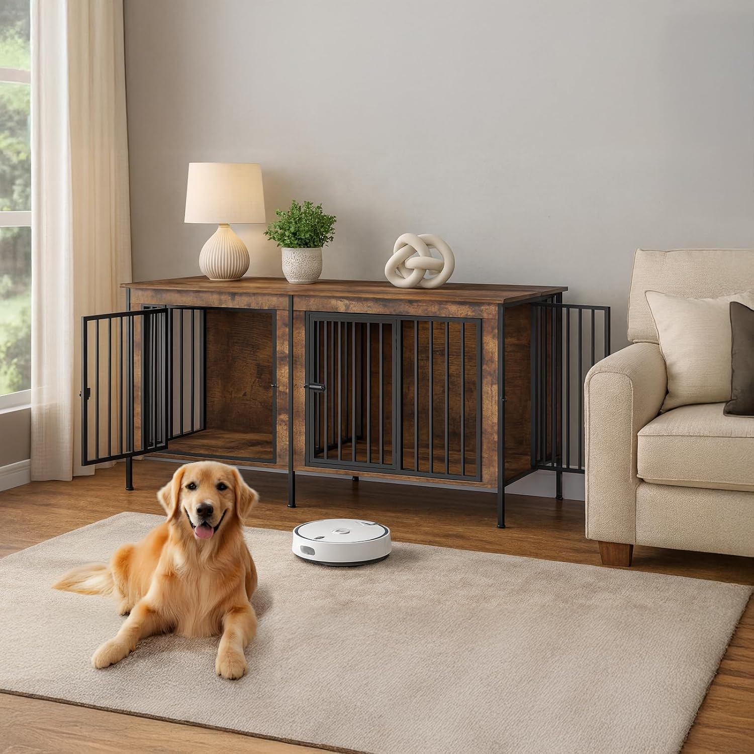 - Robot-Ready Raised Base: Four 3.9-inch legs lift the dog kennel furniture off the floor so most robot vacuums glide underneath, whisking away hair and crumbs without moving the crate. Airflow below keeps bedding dry and guards dogs from damp or cold floors.