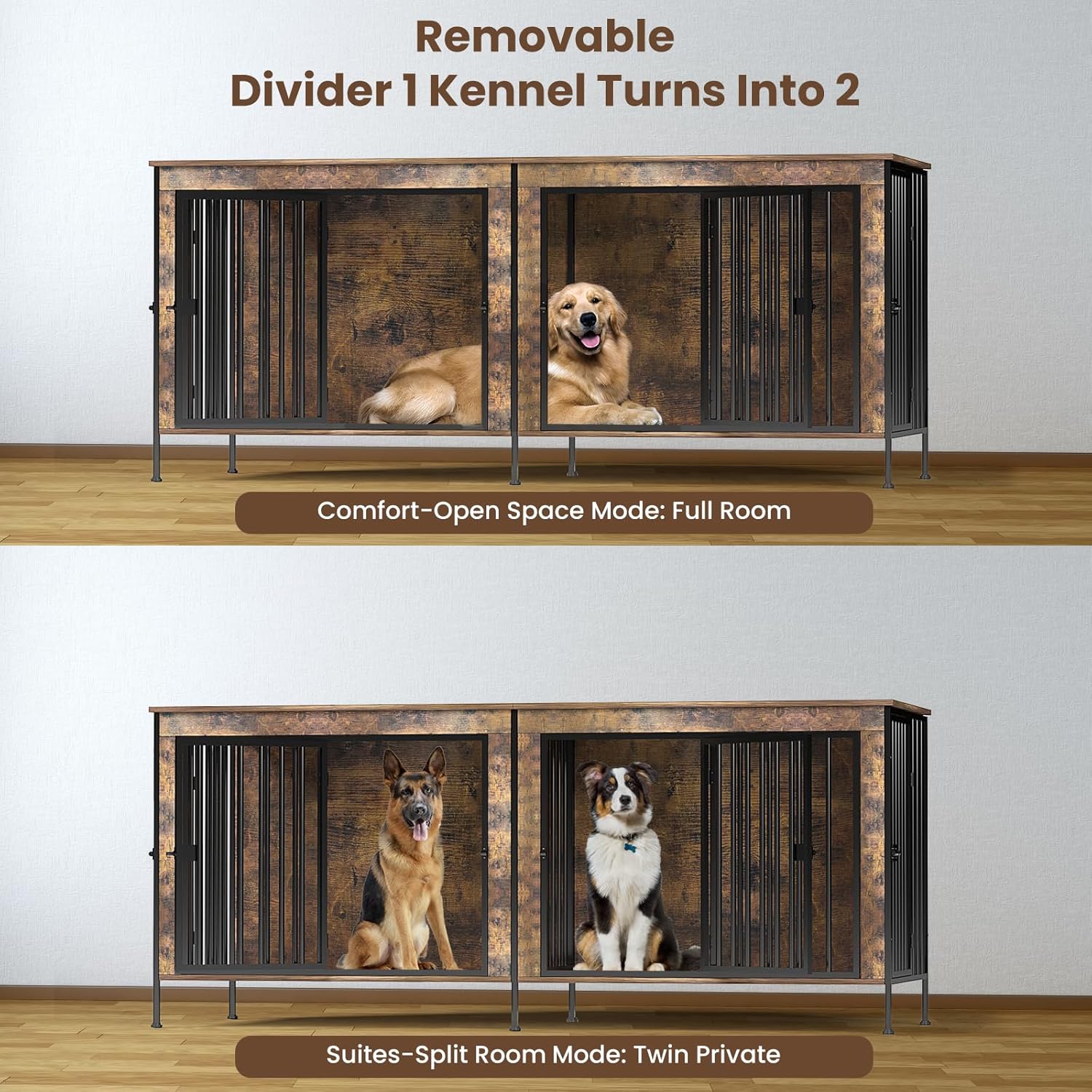 - Room for Two Large Dogs: At 78"L ร 27.5"W ร 33"H, this TimberAura dog crate furniture offers two roomy dens so Golden Retrievers or German Shepherds can lie flat and turn comfortably. The built-in center divider creates two separate dens, giving each dog its own space and helping reduce stress during feeding or rest.