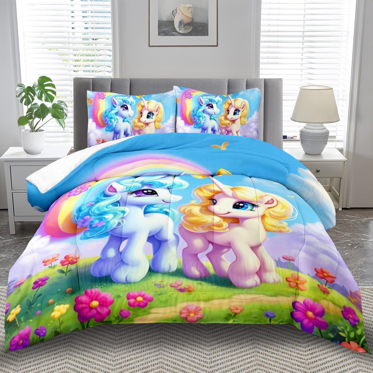 - King Size Rainbow Unicorn Comforter Set :This bedding set includes 1 comforter(67" x 85") and 2 pillowcases(20”x30”). In order to facilitate transportation, the quilt is made of vacuum compression technology. It will be slightly wrinkled when taken apart, but it will quickly regain its fluffiness if you gently beat it.