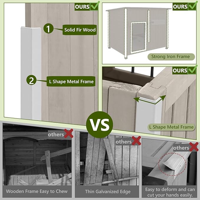- 【DURABLE & CHEW-RESISTANT DESIGN】Crafted from solid fir wood and reinforced with a chew-resistant iron frame, this outdoor dog house resists cracking, warping, and biting. The sloped asphalt roof is weatherproof, preventing water and snow buildup to keep the interior dry. Built to last and protect your pet in any season.