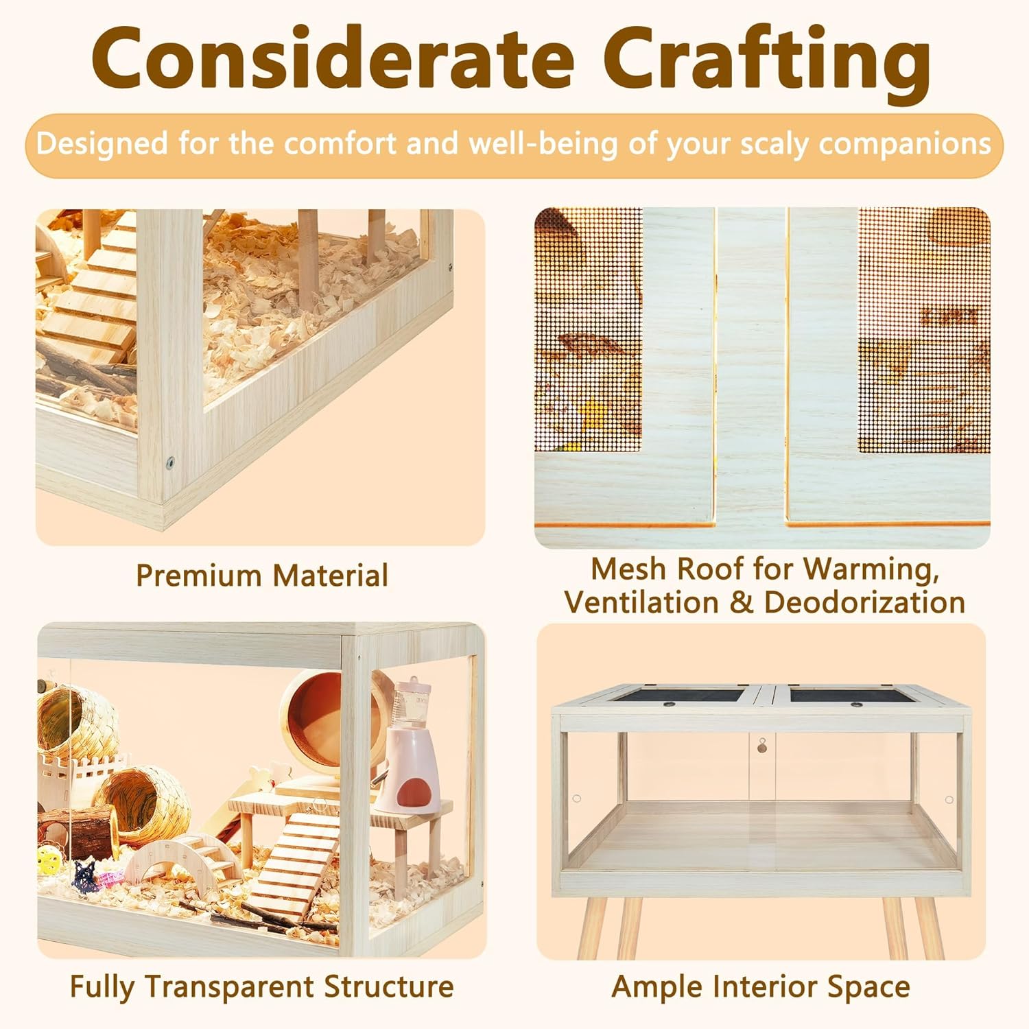 - 【Premium Materials】Available in 4 sizes ranging from 24 to 48 inches in length, with 24 or 27.5 inches legs' height, please refer to picture 2 for size information. Crafted from durable, high-density natural wood treated with a rot-resistant, waterproof coating, our cage ensures longevity and aesthetic appeal. Transparent acrylic panels provide a clear view of your cherished hamsters' activities. An additional acrylic sheet on the cage bottom prevents moisture buildup, simplifying cleaning tasks.