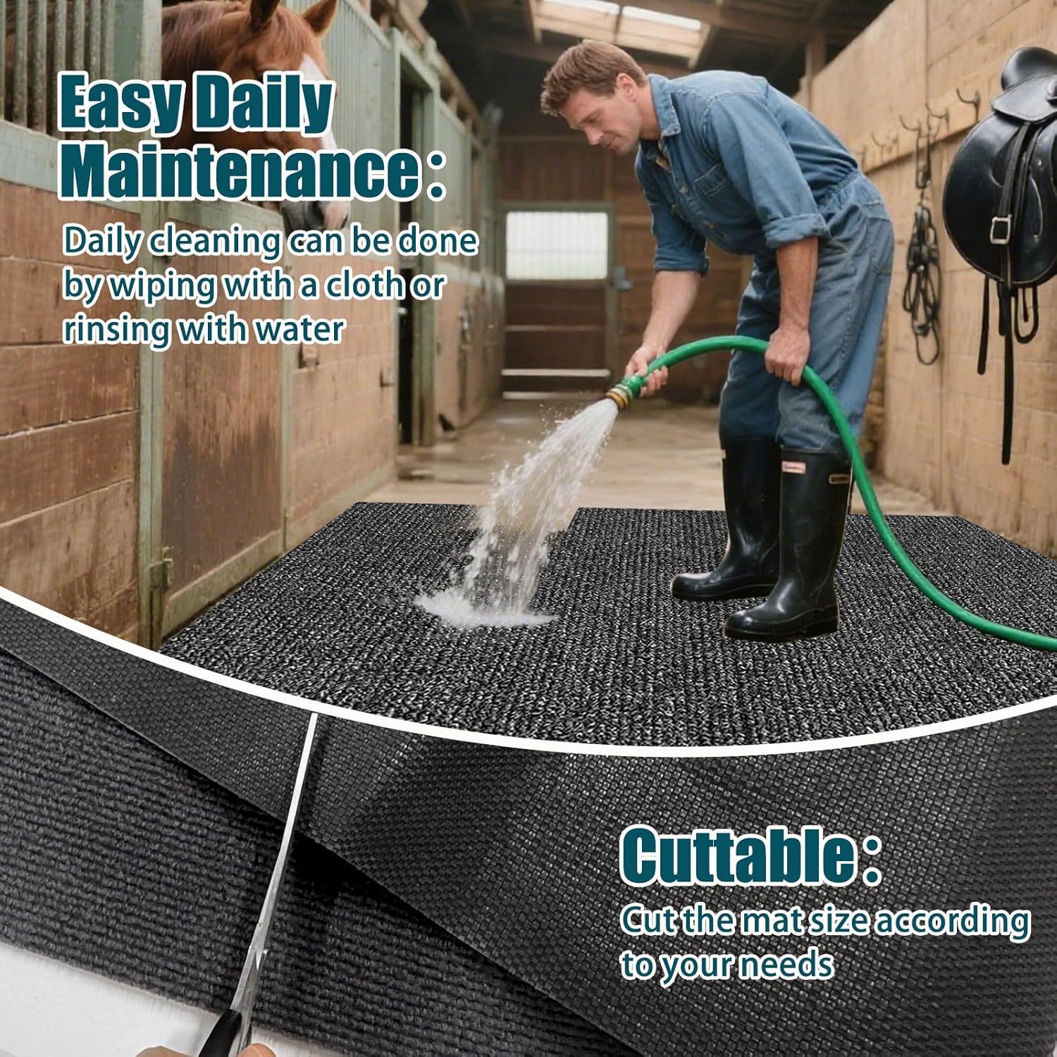 - Easy to Clean:Our stable bedding can be easily cleaned with water or a simple brush to remove stains and odours, requiring no complicated maintenance;The quick-drying material helps keep the stable clean and hygienic