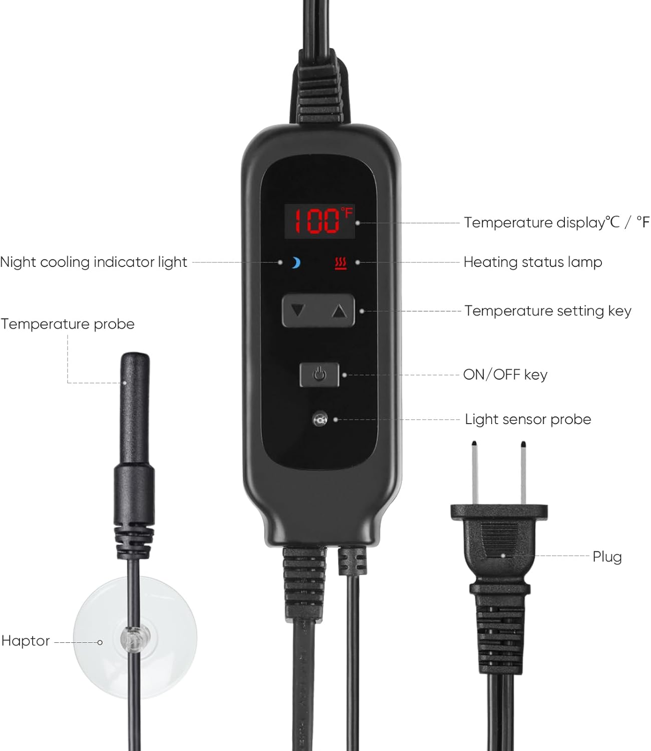 - Two Working Modes:The reptile heat lamp with dimming thermostat offers two operational modes: The PID constant temperature control mode enhances stability and efficiency in temperature regulation, extending the lifespan of the reptile heat bulb. The day/night temperature difference mode utilizes a light-sensitive probe to detect natural light variations, automatically reducing the temperature by approximately 4°F during the night. This creates a more natural, stable, and comfortable environment for reptiles.