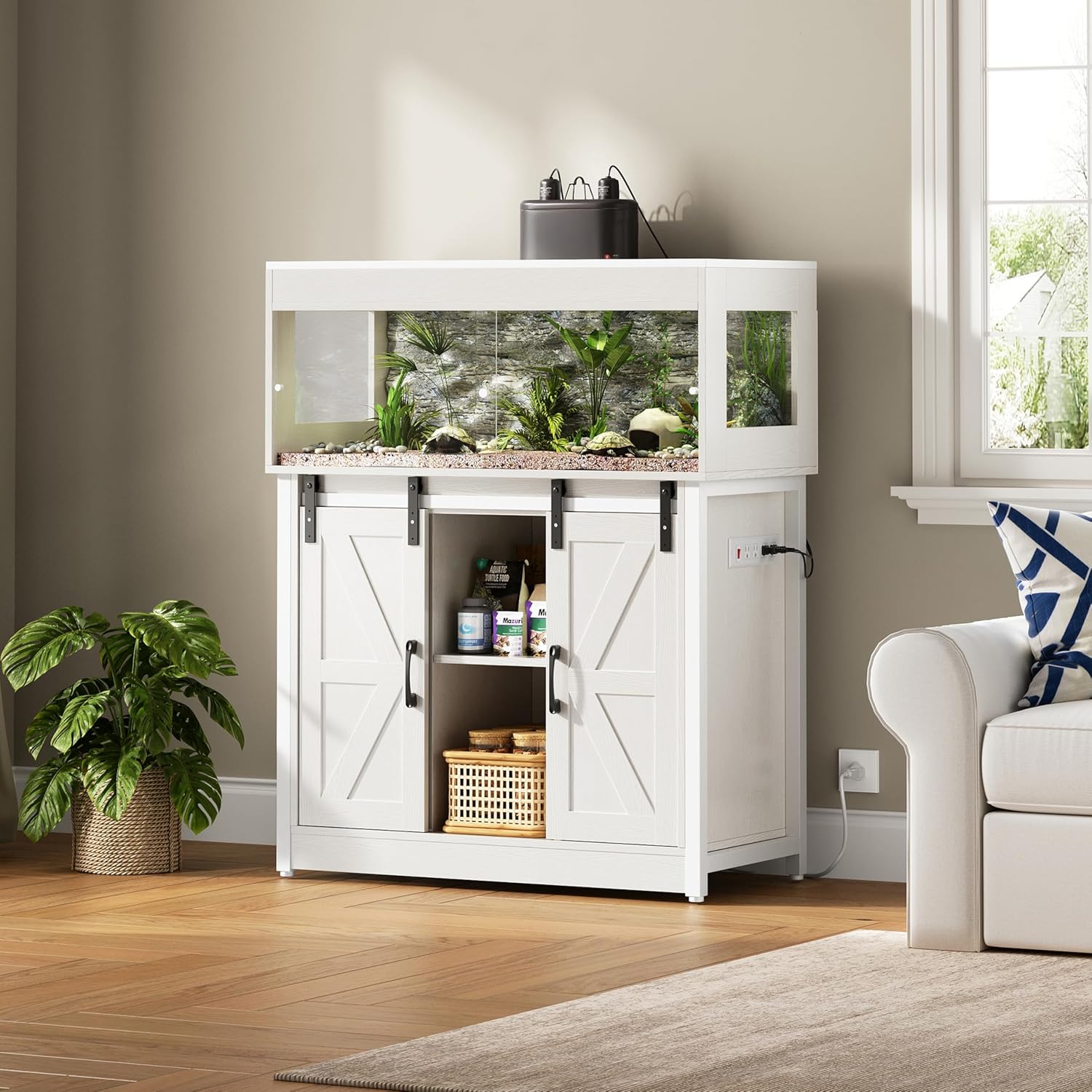 - Multifunctional Storage Stand - Equipped with dual barn-style side compartments and a double-shelf center section, this stand lets you neatly store UVB lights, heating pads, hygrometers, treats, and bedding. It’s a practical and visually appealing reptile tank stand / terrarium stand that helps you maintain a clutter-free and systemized reptile care space.