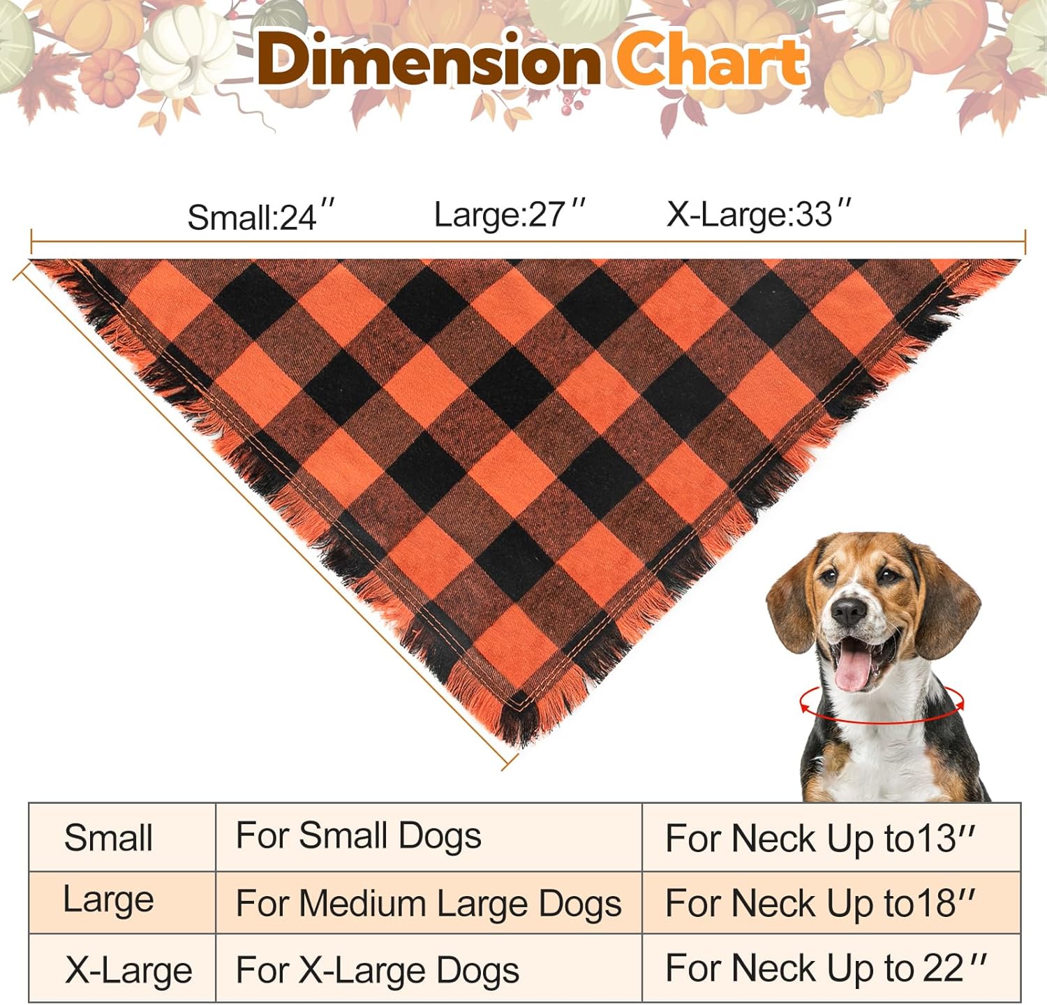 - 【MULTIPLE SIZES 】This fall dog bandana comes in three different sizes to ensure a perfect fit for every pup. Small fits necks up to 13", Large fits necks up to 17", X-Large fits necks up to 22". Please measure your pets’ neck girth before ordering, and leave room to tie out