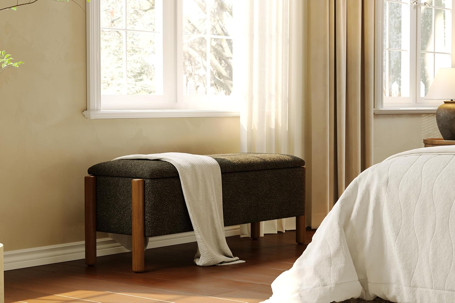 - ELEGANT & TIMELESS DESIGN: Elevate your space with this stylish Storage Bench featuring genuine walnut wood-grain legs and plush 5.5cm cushioned seating. Wrapped in skin-friendly loop yarn fabric, this chic Ottoman Bench seamlessly enhances bedroom, end of bed, entryway, or livingroom decor while offering lasting comfort.